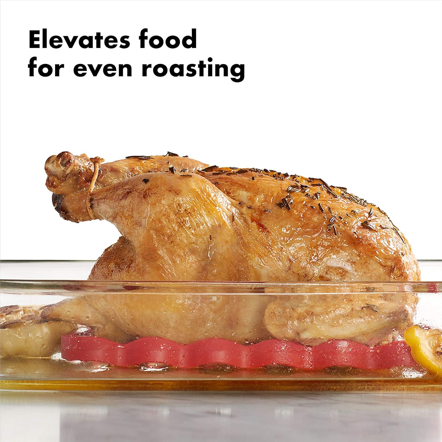 Elevate your cooking experience with the OXO good grips roasting rack. The rack lifts food above the bottom of the pan to help prevent sticking and burning, and allows fat and grease to drain for healthier cooking (no more soggy bottoms!). the open design promotes air circulation for fast, even roasting of roasts, poultry, fish, bacon and vegetables. The silicone construction also makes it perfect for use as a trivet, while also being a breeze to clean. Use this set of two separately, side by side in the same pan, or stacked for extra elevation.
