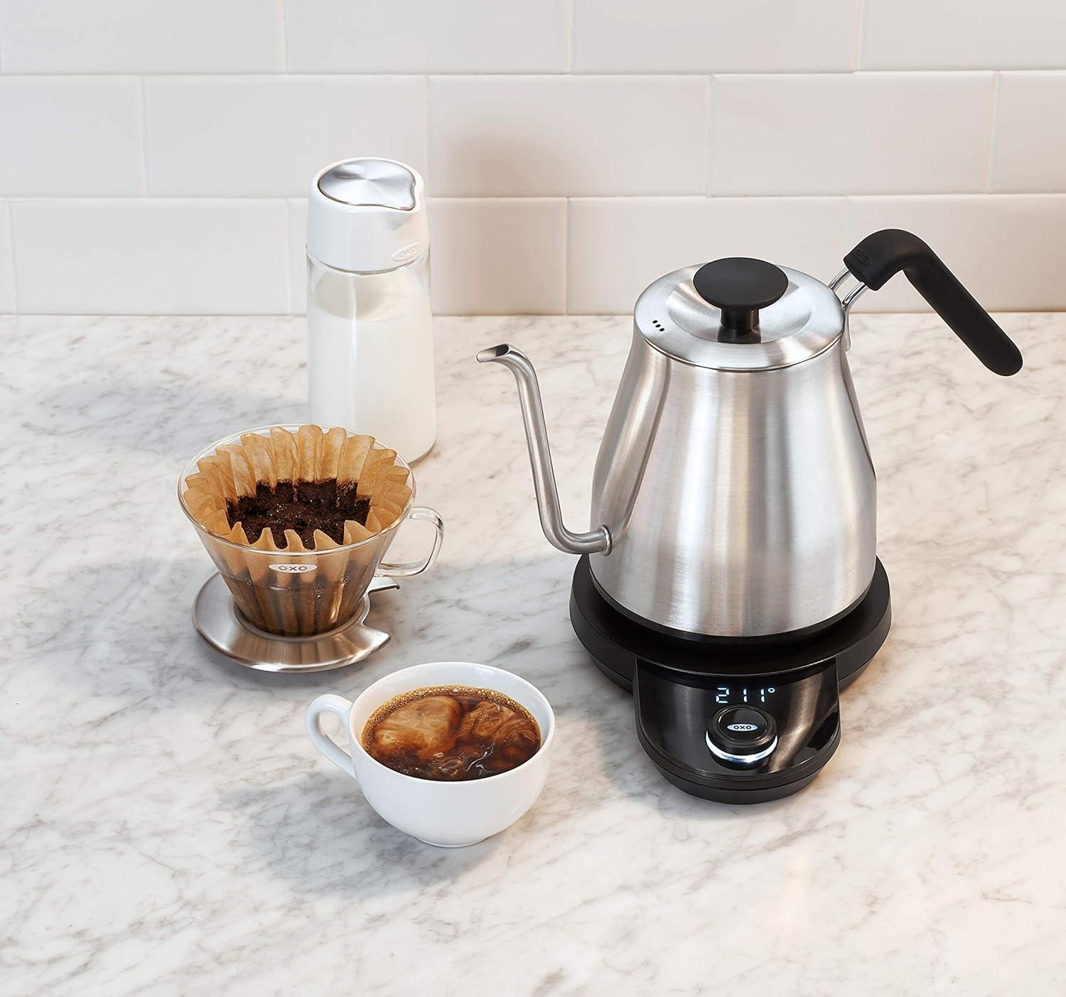 OXO Brew Gooseneck Electric Kettle – Hot Water Kettle, Pour Over Coffee & Tea Kettle, Adjustable Temperature, Built-In Brew Timer, Stainless Steel, 1L