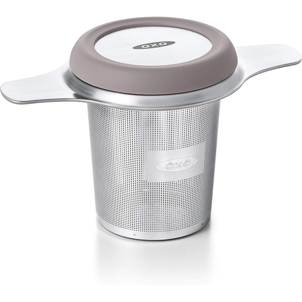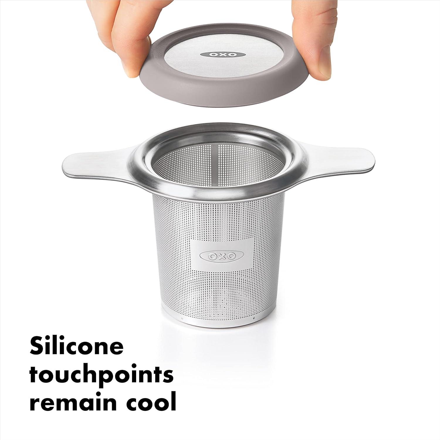 Brew the perfect cup of your favorite loose leaf tea with the OXO Tea Infuser Basket. The large-capacity stainless steel basket is calibrated for maximum flavor extraction and shaped to sit nicely in any mug. The etched hole pattern keeps even the tiniest tea particles contained, while the dual-function lid retains heat and doubles as a drip tray to reduce mess. Tea infuser works with all loose teas, including green tea, black tea, and herbal tea. Stay-cool silicone touchpoints ensure the entire brewing experience is a ritual you savor.