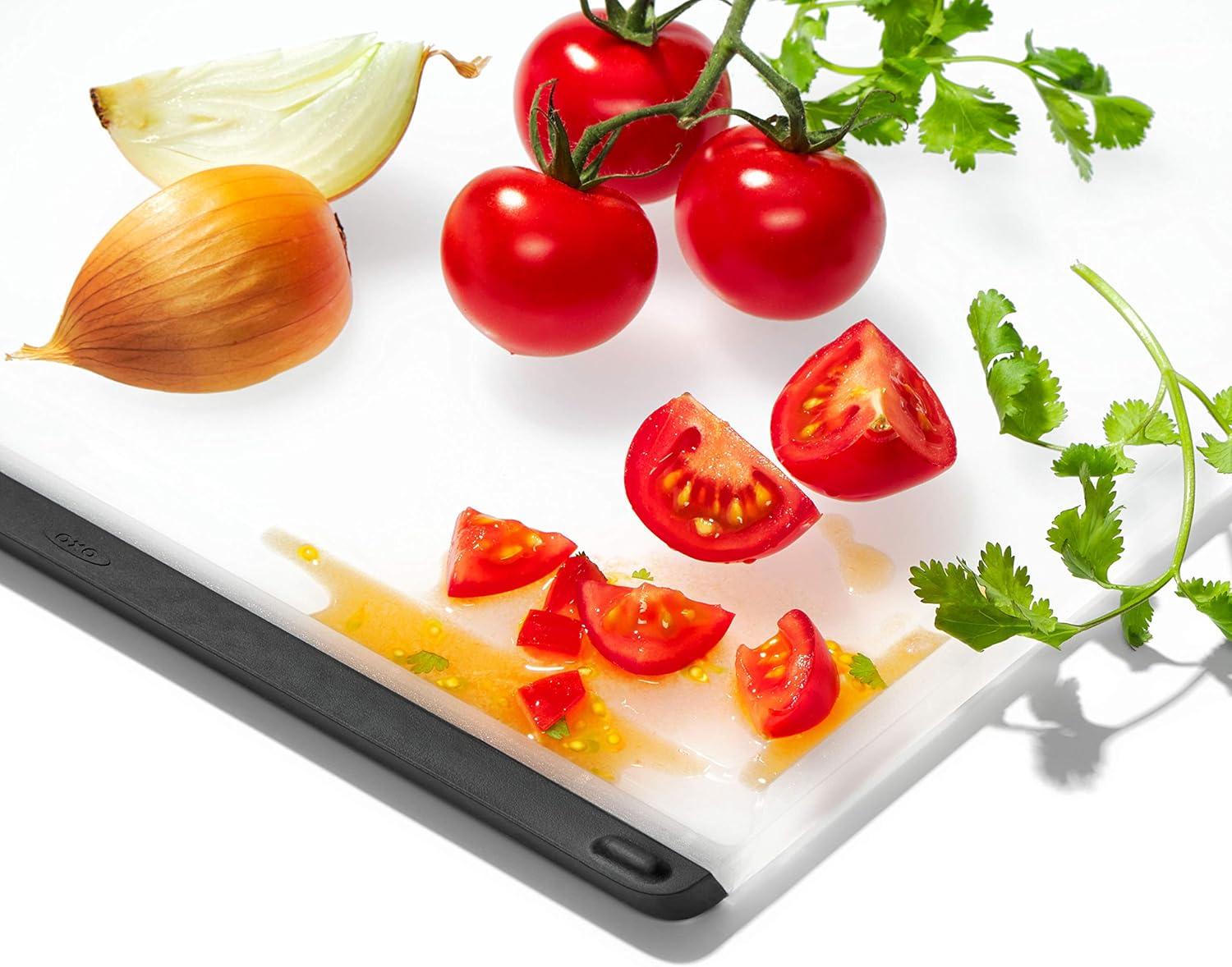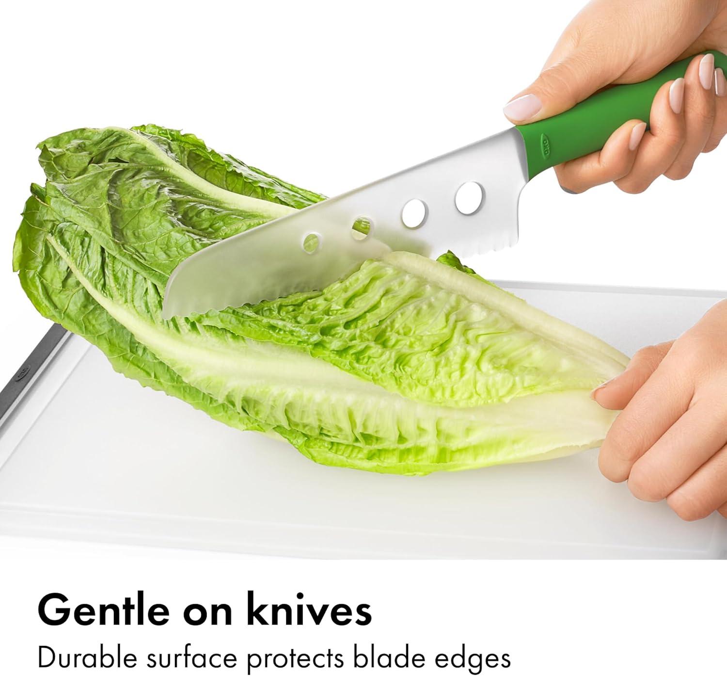 Streamline your slicing, dicing and chopping with the OXO 2-Piece Cutting Board Set. The non-porous design locks out liquids and odors for a fresh surface every time, while the clever double-sided construction helps prevent cross-contamination. Use the grooved side for meats and the smooth side for produce to keep flavors from mingling as you work. Soft, tapered edges double as handles for comfortable lifting and the durable surface is gentle on knives. Non-slip feet keep each cutting board secure for safety as you slice. The smaller Prep Board is perfect for trimming veggies or slicing cheese, while the Everyday Board is ideal for family meals, making this set a versatile kitchen essential and a great fit for kitchens of all sizes. Both boards include an integrated drip-catcher to contain juices, with easy-pour corners for quick cleanup. Dishwasher safe and built to last, these cutting boards are reliable home and kitchen tools. They complement your favorite kitchen appliances and gadgets, making meal prep and cleanup easier.