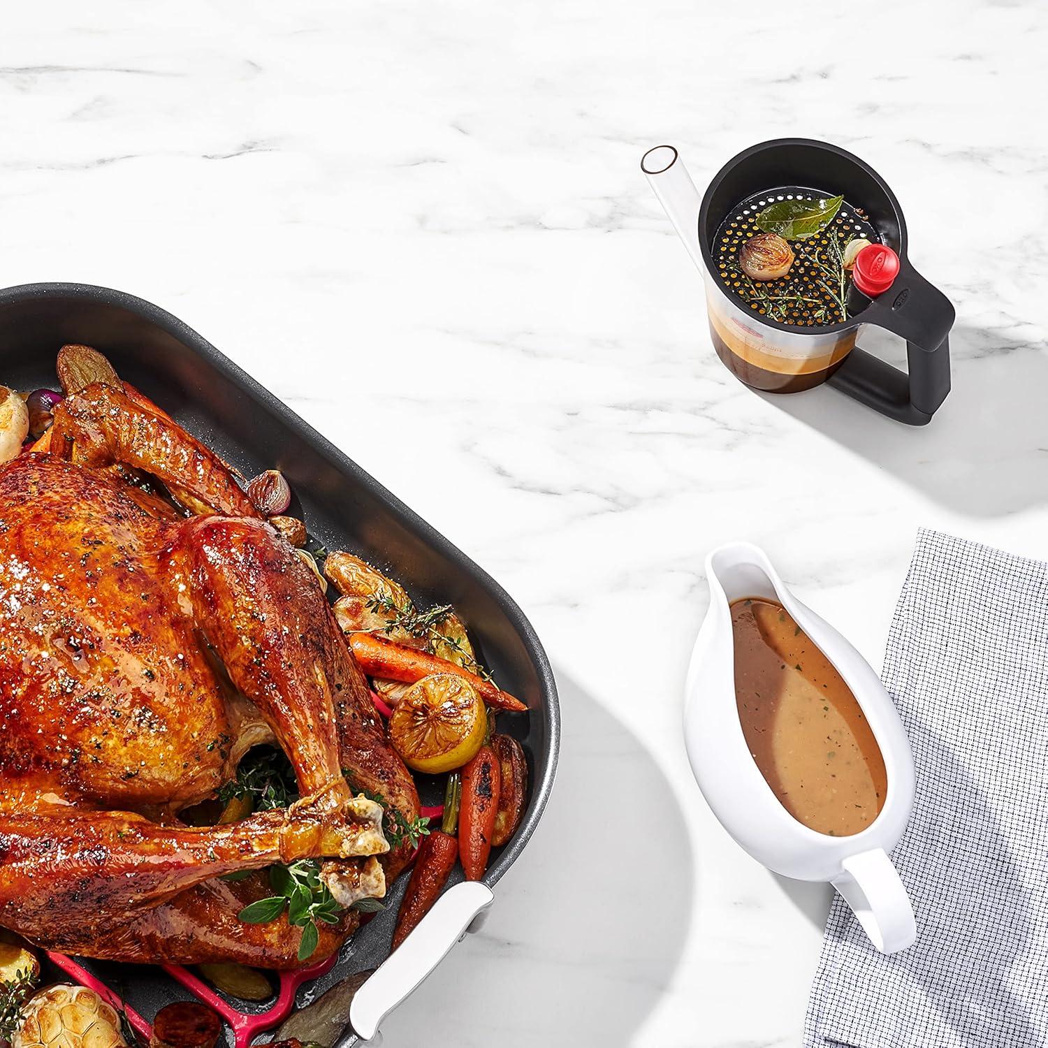 Making gravy has never been easier with the OXO Good Grips Fat Separator. Simply place the stopper in the spout and when you pour pan drippings into the fat separator, the strainer will separate unwanted bits and the fat will rise to the top. Remove the stopper and pour, and the flavorful cooking liquid will come out first, allowing you to leave the fat behind. The measurement markings make following recipes simple, and the splatter shield helps prevent splashing while you pour. When you’re done, this Separator is dishwasher safe, and there is a built-in storage spot in the strainer to keep the stopper so it doesn’t get lost. Available in 2-Cup and 4-Cup sizes.