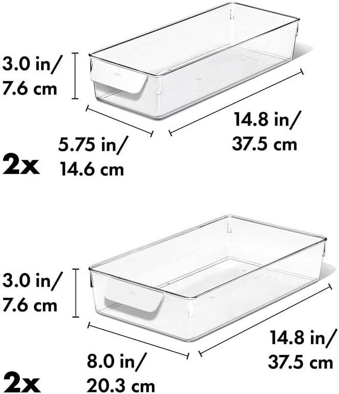 Organize the contents of your fridge to cut down on clutter and prevent food waste. The OXO Good Grips Fridge Organization System features a combination of bins, drawers, shelves, and risers, to help streamline your refrigerator. Our 4-Piece Refrigerator Storage Bin Start Set has everything you need to keep produce, beverage, condiments and more, tidy and in view. Included in the set are four clear, space-saving Bins, in two different sizes designed to create a customized, modular system for your fridge. The rounded handles provide a comfortable grip, especially helpful while prepping a recipe or for little hands grabbing a snack. A smooth base allows the Bins to glide easily so you can keep an eye on food expiration dates. The.75 in x 14.8 in x 3 in Bins are perfect for yogurt cups, berry bins and small produce, while the 8 in x 14.8 in x 3 in Bins are sized to hold cheese, deli or packaged meat and fish.