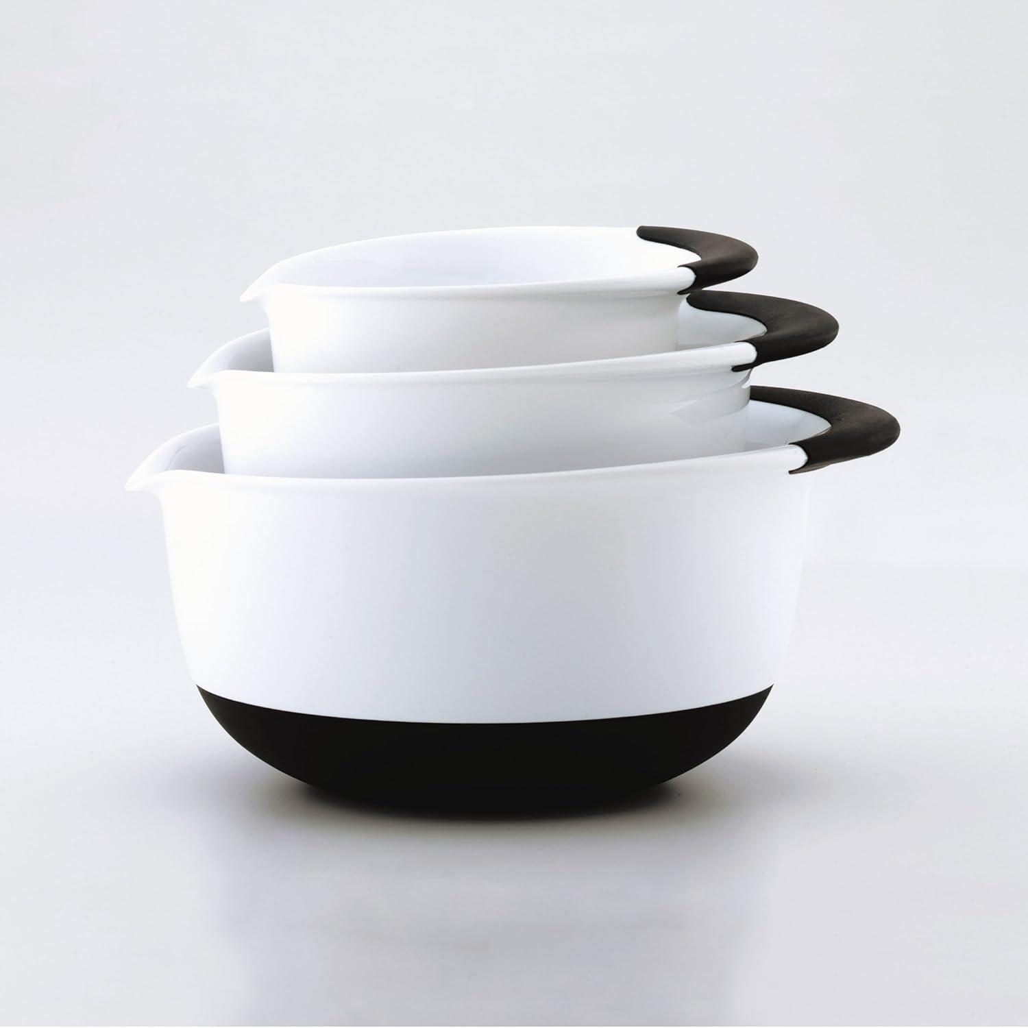 The OXO Good Grips Mixing Bowls help you tackle any culinary project, from whisking eggs to mixing cupcake batter to making marinade. The Bowls feature soft, non-slip handles. Non-skid bottoms stabilize the Bowls on any kitchen surface, even at an angle. Wide lips and spouts make pouring ingredients easier. Plus the Mixing Bowls nest neatly for convenient storage. Available in blue, green and yellow with black handles; white with blue, green and brown handles; and white with black handles. BPA free and dishwasher safe.