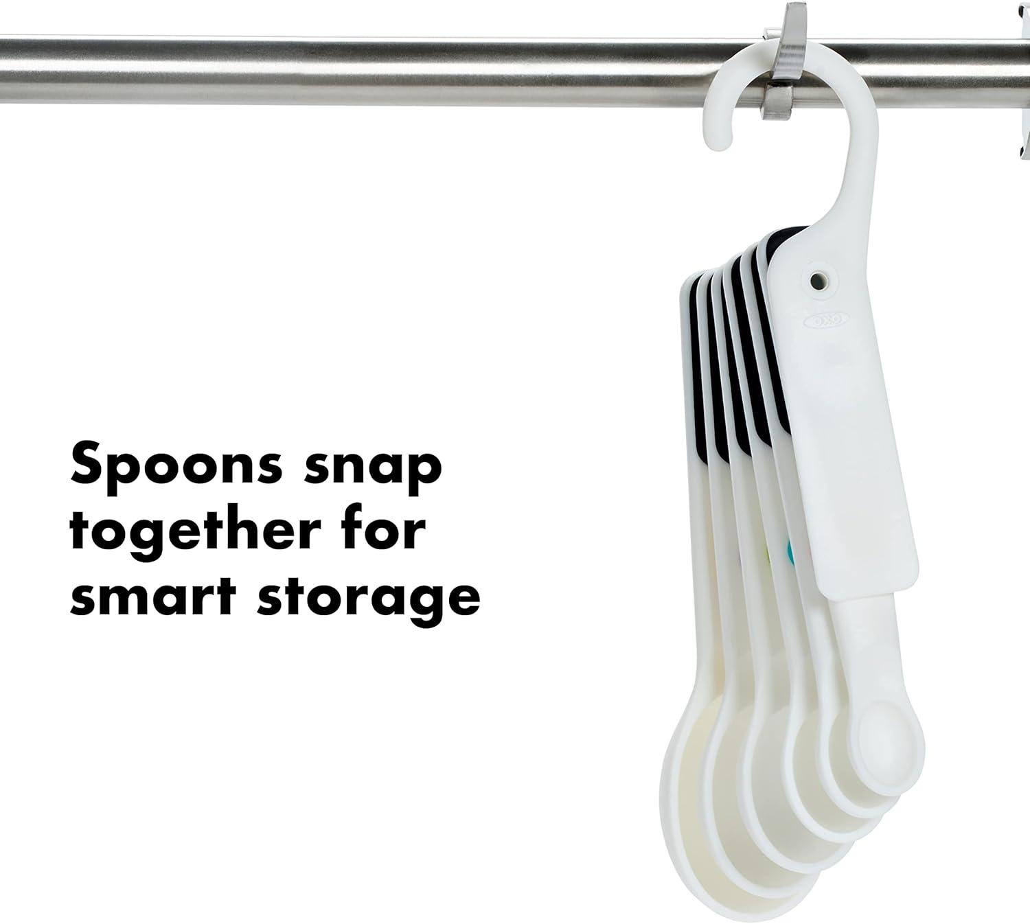 The OXO Good Grips 7 Piece Measuring Spoons Set makes finding the right Spoon a snap. The unique snapping feature that keeps the Spoons together for storage also allows you to fan the Spoons out, so you can find the size you need on the first try. This feature also allows you to take out just the Spoon or Spoons you need, leaving the rest neatly snapped together. The Spoon handles have soft, comfortable, non-slip grips and color-coded, easy-to-read measurement markings. The Spoons also rest flat on the counter to prevent tipping and spilling. The Set includes a scraper that can be used to level ingredients, which also has a hook on it for hanging storage when needed. This dishwasher safe set includes a scraper, 1/8 tsp, 1/4 tsp, 1/2 tsp, 1 tsp, 1/2 T, 1 T Measuring Spoons.