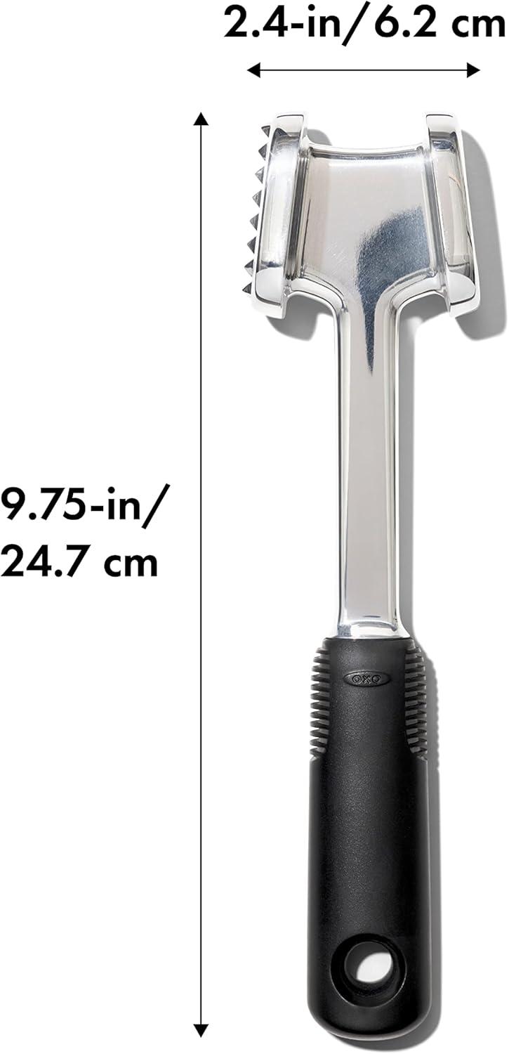 Make short work of prepping proteins for cooking with the OXO Good Grips Die-Cast Meat Tenderizer. This two-sided mallet lets you pound chicken flat for faster broiling or tenderize steaks so they melt in your mouth. The pyramid-shaped teeth are perfect for breaking down tougher fibers to tenderize and prepare meats for marinating. The smooth side quickly flattens meats to a uniform thickness for quick, even cooking. The angle and weight of the head are designed to maximize force without tiring you out. The soft handle fits comfortably in your hand while you work, while its non-slip grip provides traction even when wet. The durable, die-cast aluminum and heavy-duty construction ensure that this useful tool will stand up to frequent use. Hand Wash Only.