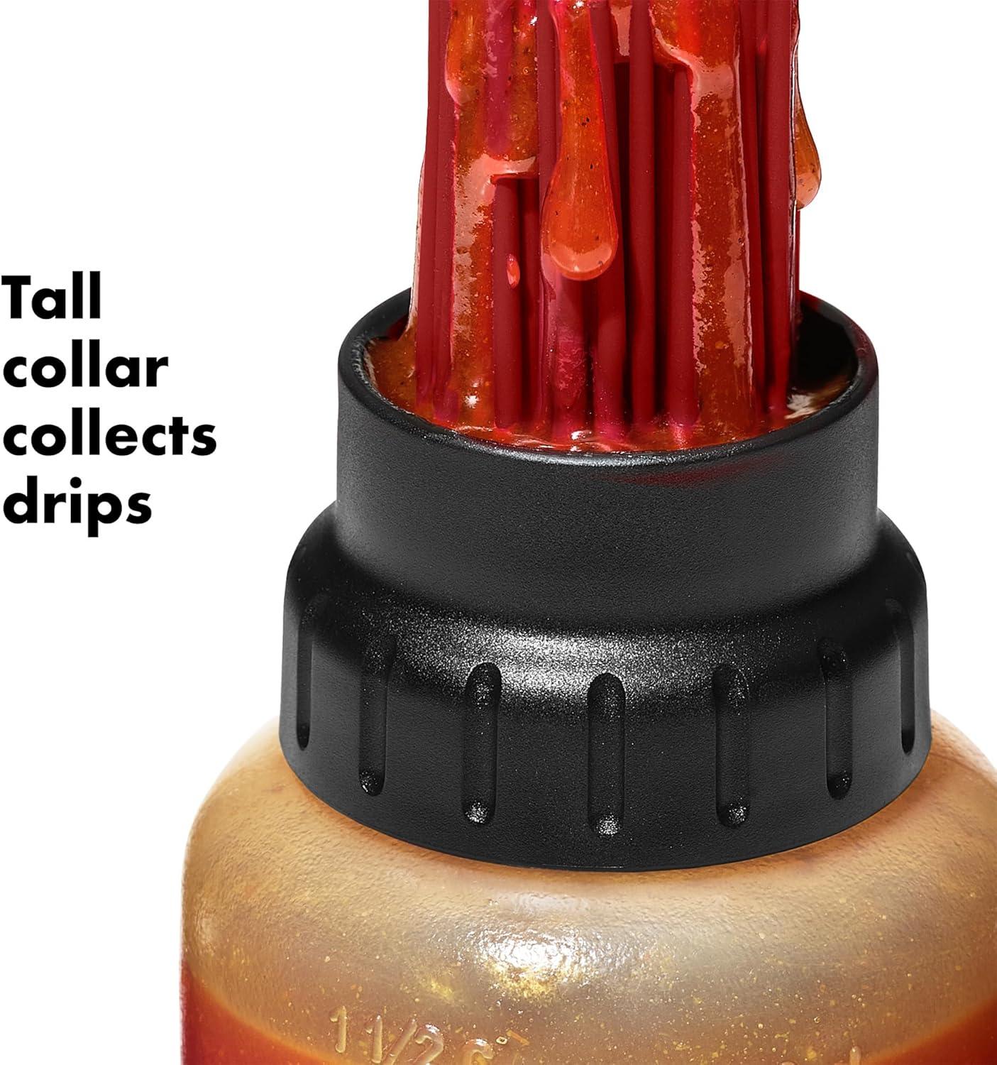 Tall collar collects sauce and keeps drips from traveling down the bottle