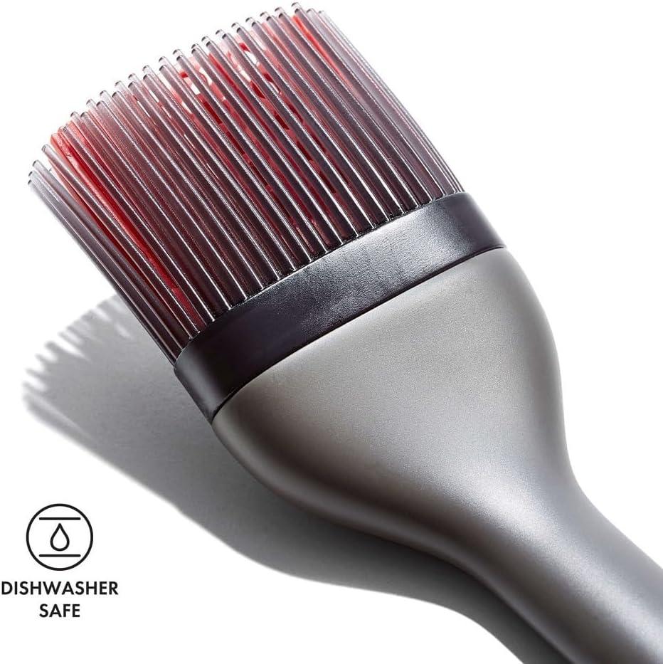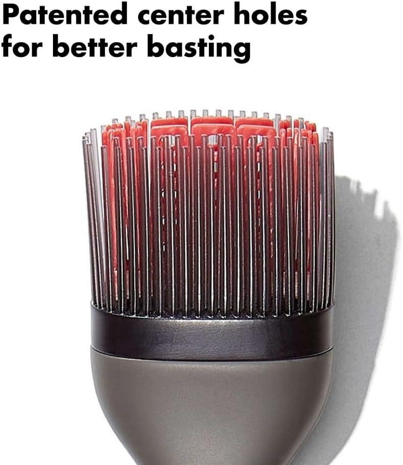 The OXO Good Grips Silicone Basting Brush helps you easily create golden-brown roasts and saucy grilled ribs. The heat-resistant silicone bristles are easy to clean: They won’t retain odors, shred or clump. Our patented center-hole bristles feature a gap that holds liquids for efficiently applying sauces or basting with drippings. The tapered design of the outer bristles lets you brush over thin and delicate foods. The angled brush head keeps bristles elevated above countertops to avoid messes. Dishwasher safe.