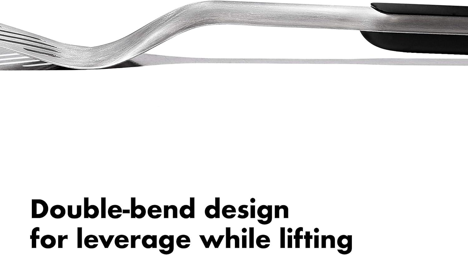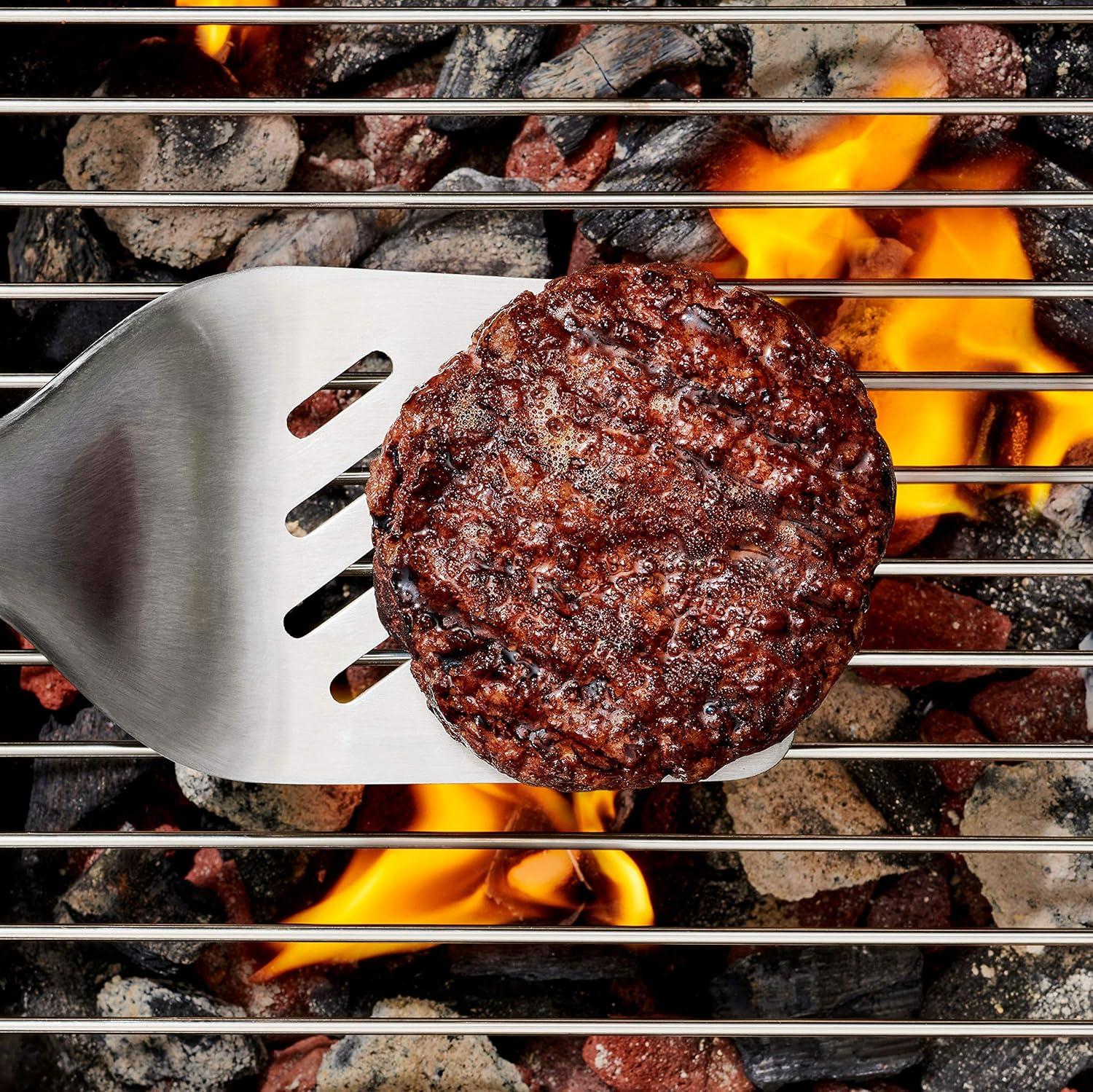 Durable stainless steel turner is perfect for flipping burgers on the grill