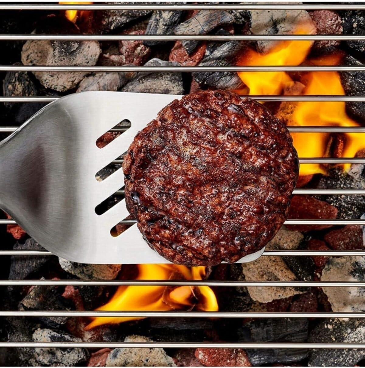 Durable turner is perfect for flipping burgers on the grill