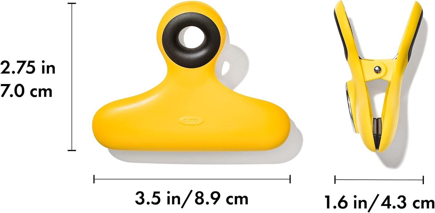 Sometimes bulkier pantry essentials such as bags of sugar of flour need a little extra help to keep their bags sealed. The OXO Good Grips Heavy Duty Bag Clips have our tightest grip yet to ensure those heavy kitchen staples stay fresh. This set of four colored clips is designed from a sturdy plastic construction and features non-slip openings and touchpoints for a secure grip. Convenient holes allow the clips to be hung, while the strong magnet attaches to the refrigerator for simple storage.