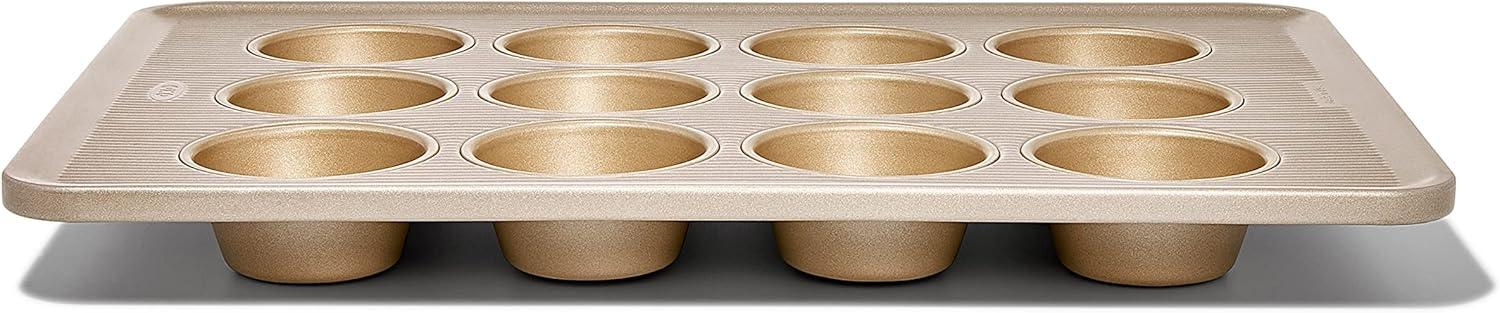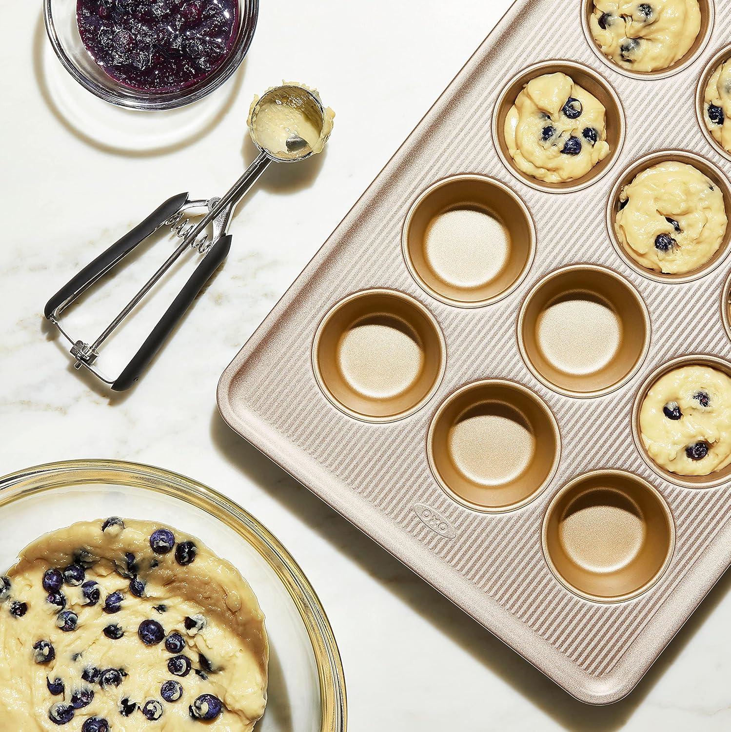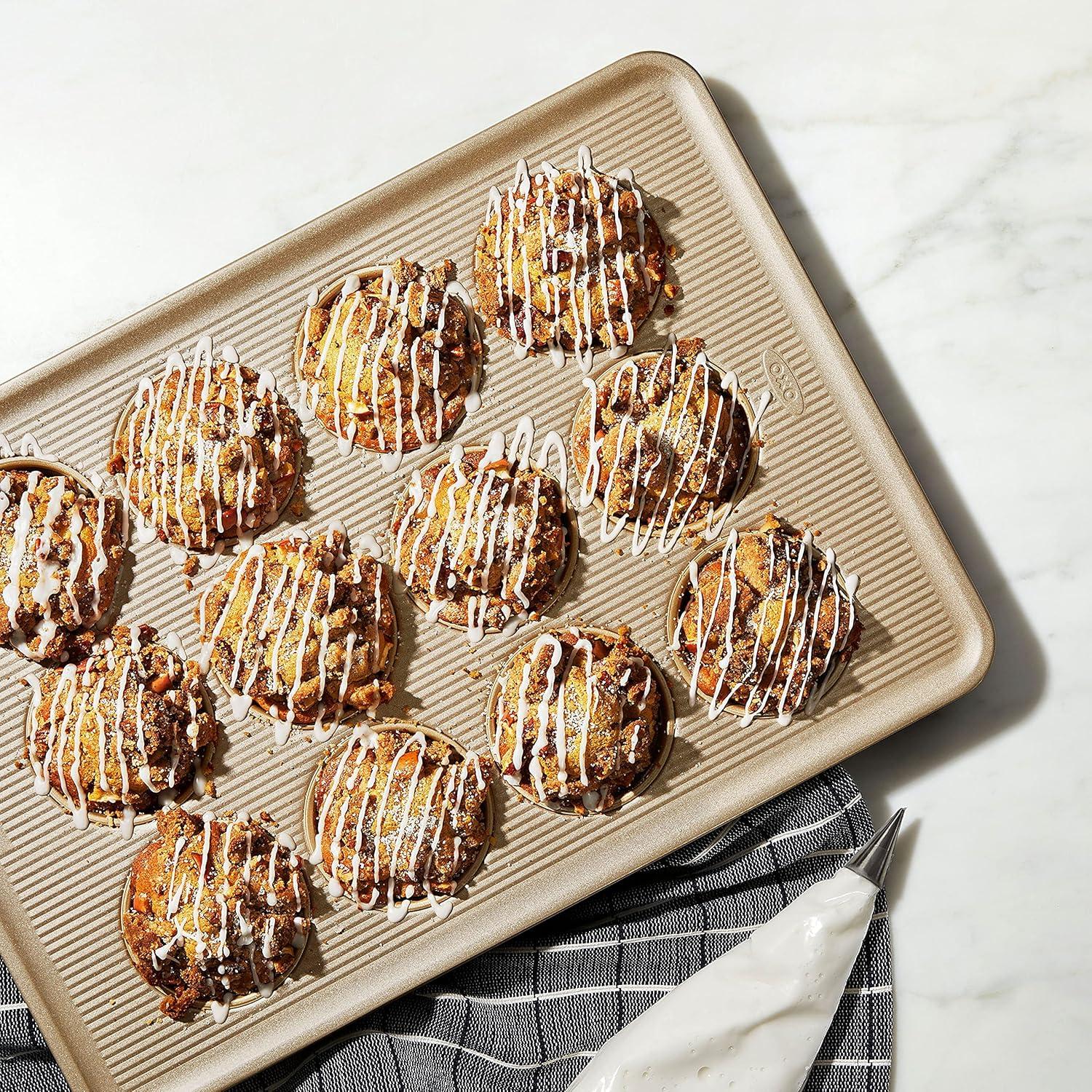 OXO Good Grips Bakeware combines precise engineering with all the thoughtful touches that go into OXO products. Non-Stick Pro Bakeware is made from durable, heavy grade aluminized steel that promotes even heat distribution. Each piece features a commercial grade, double layer, ceramic-reinforced PTFE coating that protects against scratching, staining, corrosion and abrasion. This dual function coating is ideal for both savory and sweet treats. The Nonstick line also utilizes a micro textured pattern to promote airflow and minimize surface contact for even baking. All OXO Good Grips Nonstick Pro Bakeware pieces feature square-rolled edges for a secure grip, and are dishwasher safe.