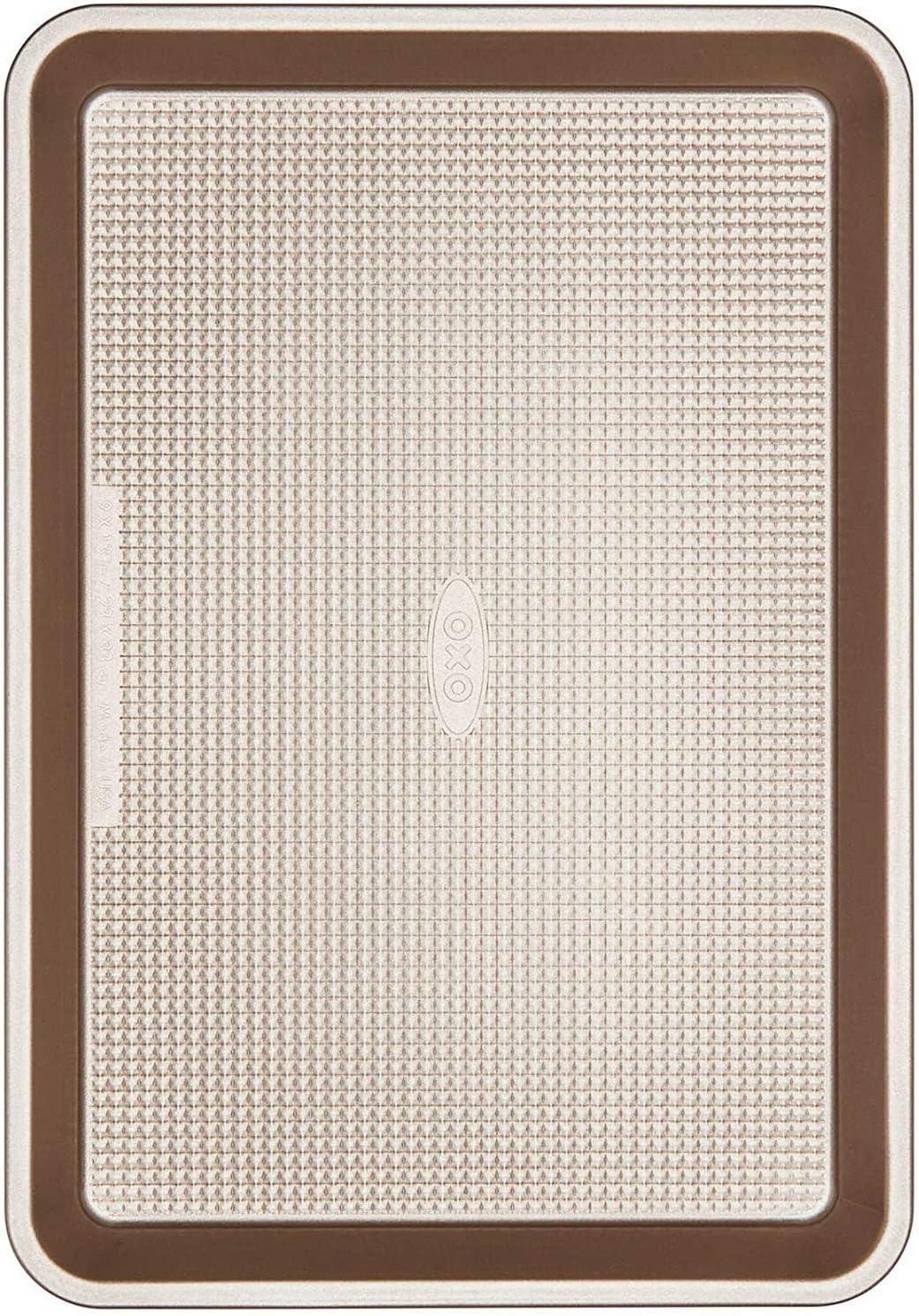 OXO Good Grips Bakeware combines precise engineering with all the thoughtful touches that go into OXO products. Non-Stick Pro Bakeware is made from durable, heavy grade aluminized steel that promotes even heat distribution. Each piece features a commercial grade, double layer, ceramic-reinforced PTFE coating that protects against scratching, staining, corrosion and abrasion. This dual function coating is ideal for both savory and sweet treats. The Nonstick line also utilizes a micro textured pattern to promote airflow and minimize surface contact for even baking. All OXO Good Grips Nonstick Pro Bakeware pieces feature square-rolled edges for a secure grip, and are dishwasher safe.
