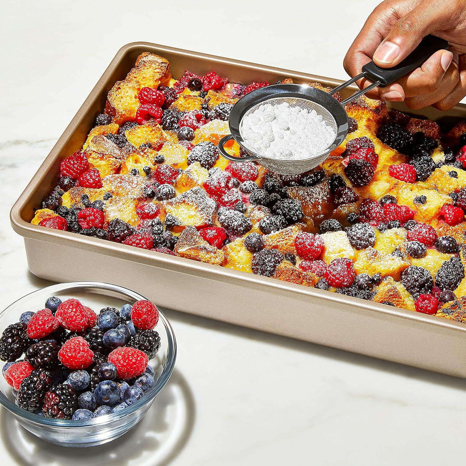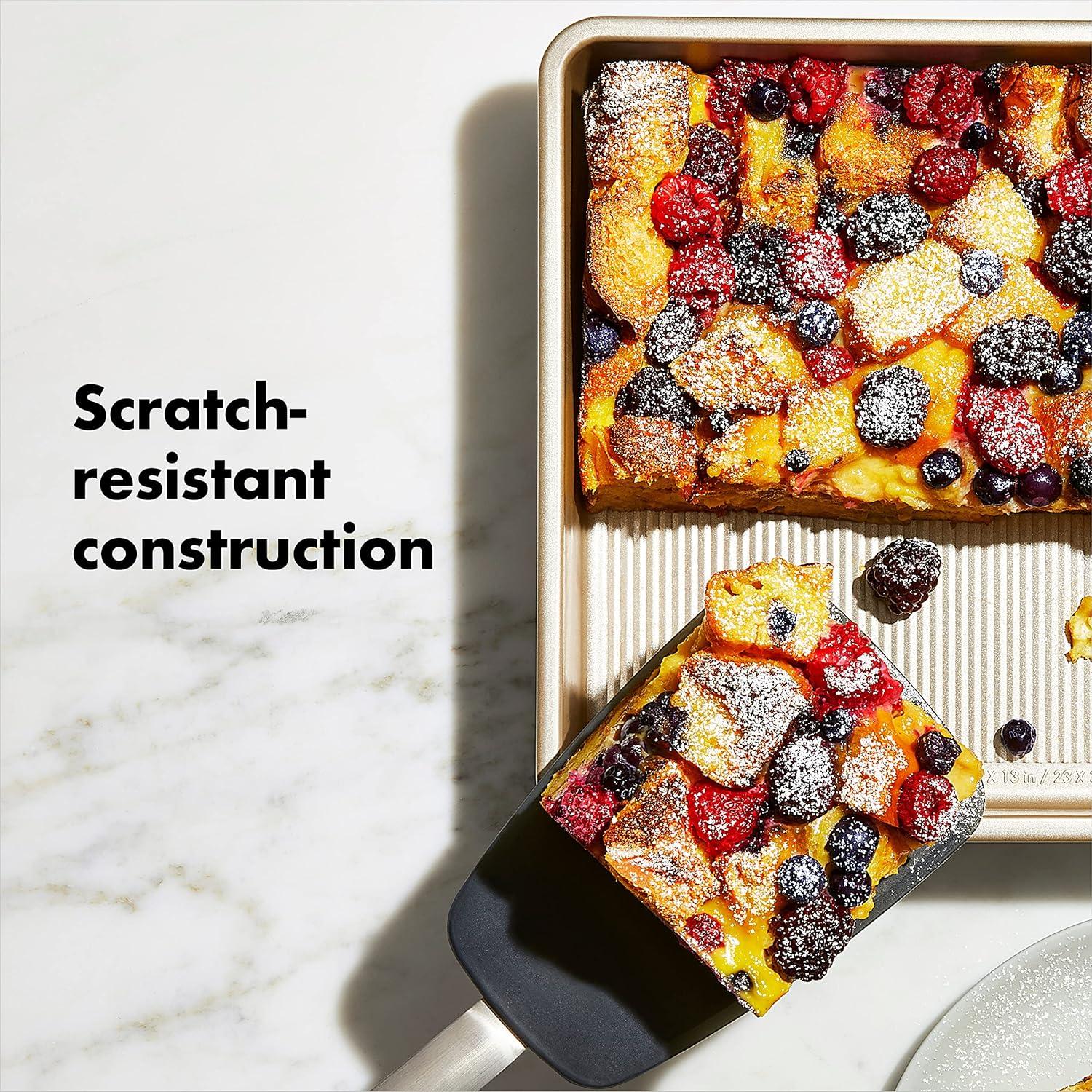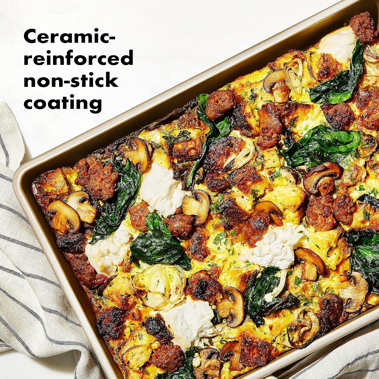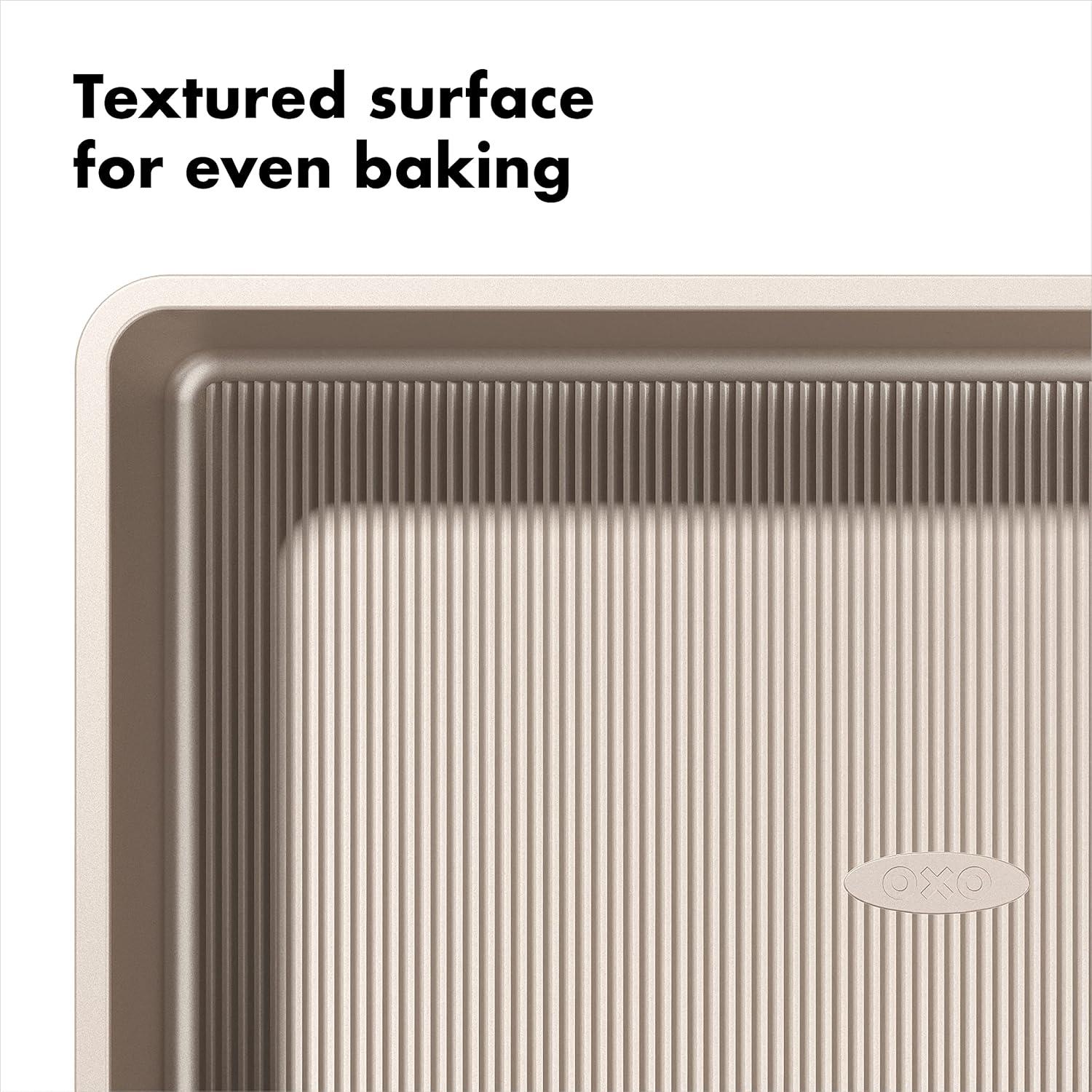 OXO Good Grips Bakeware combines precise engineering with all the thoughtful touches that go into OXO products. Non-Stick Pro Bakeware is made from durable, heavy grade aluminized steel that promotes even heat distribution. Each piece features a commercial grade, double layer, ceramic-reinforced PTFE coating that protects against scratching, staining, corrosion and abrasion. This dual function coating is ideal for both savory and sweet treats. The Nonstick line also utilizes a micro textured pattern to promote airflow and minimize surface contact for even baking. All OXO Good Grips Nonstick Pro Bakeware pieces feature square-rolled edges for a secure grip, and are dishwasher safe.