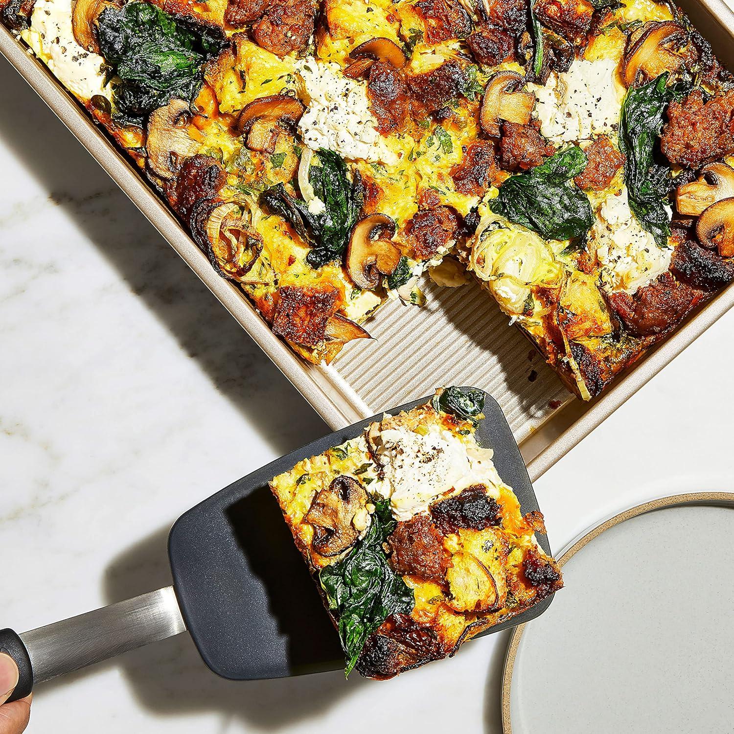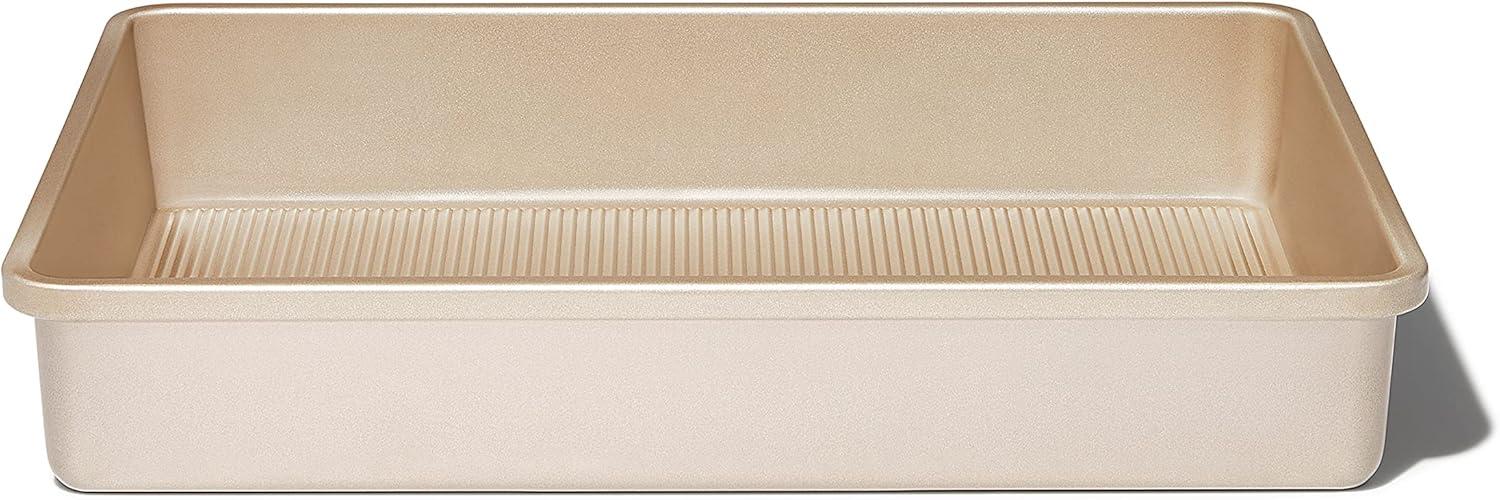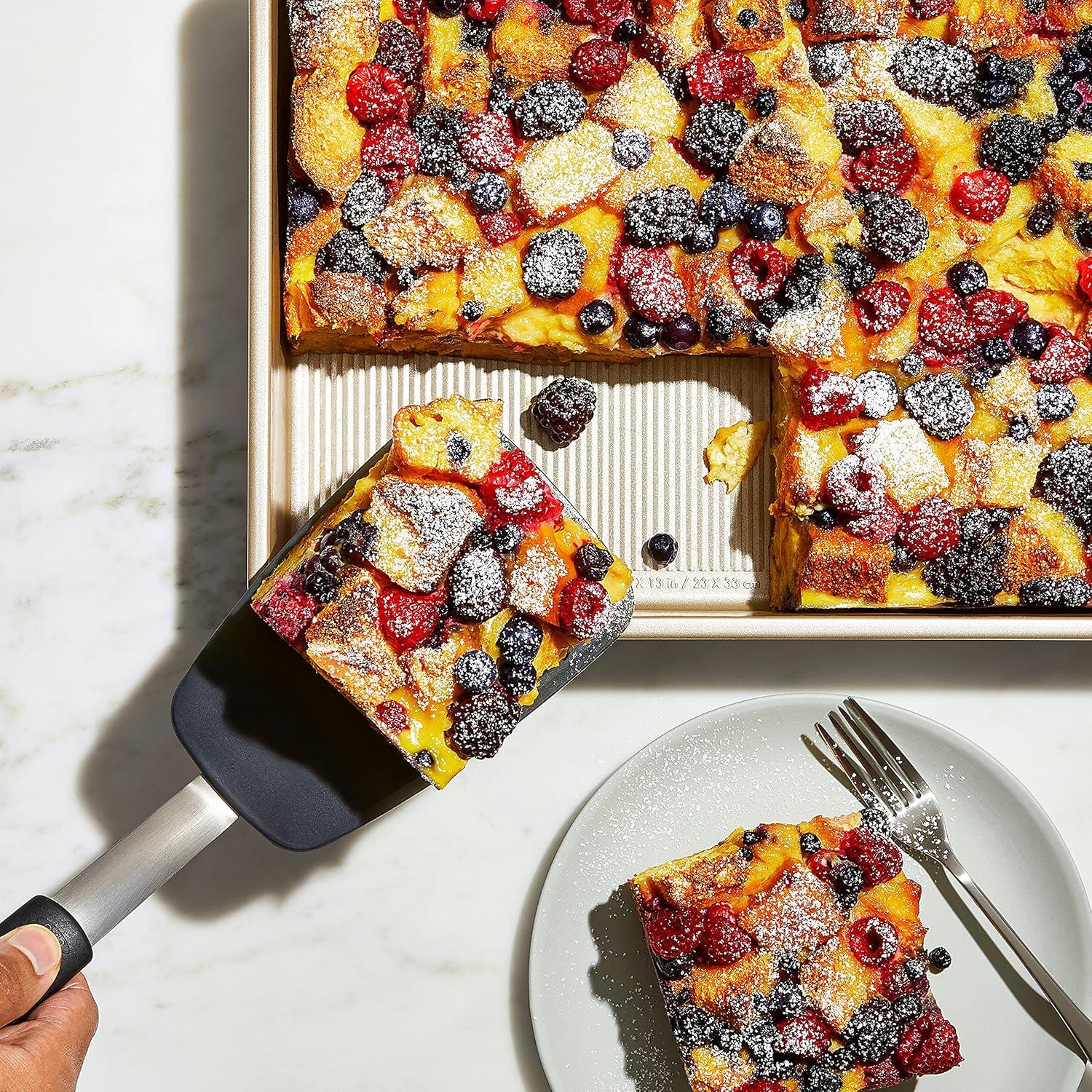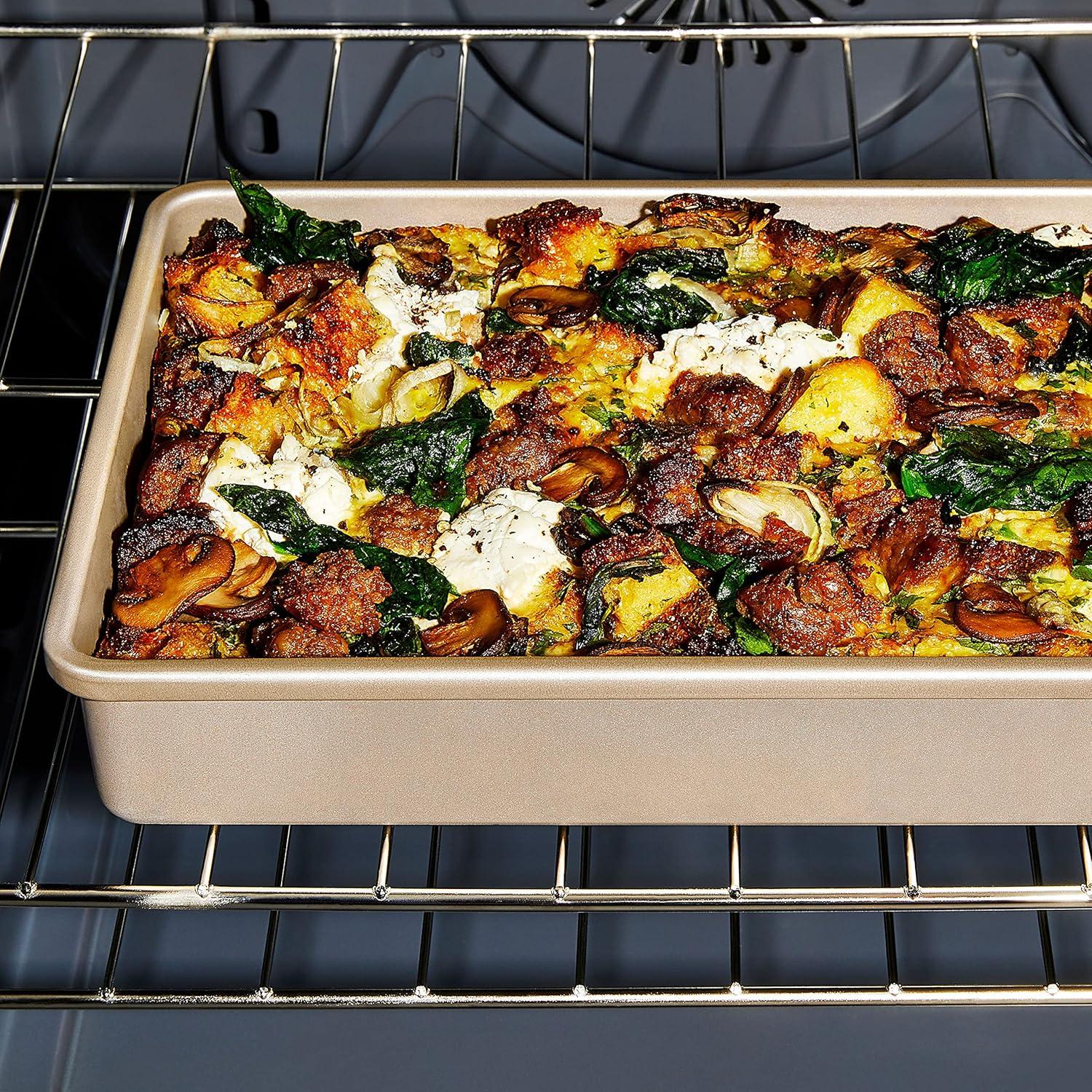 OXO Good Grips Bakeware combines precise engineering with all the thoughtful touches that go into OXO products. Non-Stick Pro Bakeware is made from durable, heavy grade aluminized steel that promotes even heat distribution. Each piece features a commercial grade, double layer, ceramic-reinforced PTFE coating that protects against scratching, staining, corrosion and abrasion. This dual function coating is ideal for both savory and sweet treats. The Nonstick line also utilizes a micro textured pattern to promote airflow and minimize surface contact for even baking. All OXO Good Grips Nonstick Pro Bakeware pieces feature square-rolled edges for a secure grip, and are dishwasher safe.