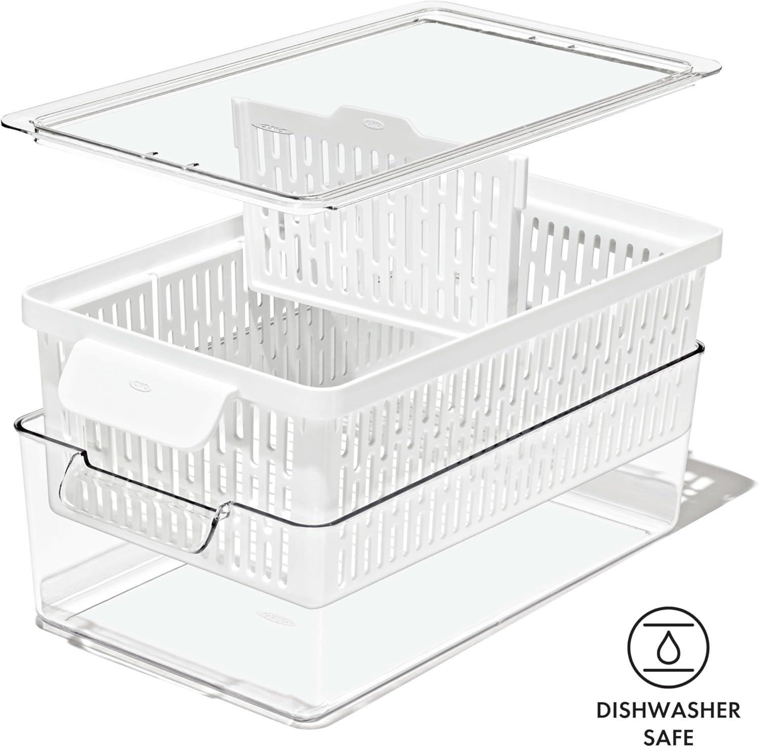 The OXO Produce Savers are fridge-friendly storage bins designed to keep your produce fresh longer. The Long Bin is the perfect size for carrots, cucumbers, eggplant, celery, scallions and other long veggies. The adjustable divider keeps produce organized and visible, which helps reduce food waste – no more finding a forgotten rotten veggie in the back of the fridge. The inner basket keeps produce elevated and promotes optimal air circulation to keep things fresh, and the basket is removable so you can use it to rinse produce. The Bin’s comfortable handle makes it easy to take the Bin to the counter, and the pivoting lid provides access whether you’re opening it in the fridge, or on the counter during prep. The Long Bin measures 14.8 in x 5.9 in x 3.6 in/37.6 cm x 15.1 cm x 9.1 cm; this BPA-free Bin is dishwasher safe and stacks with other OXO Produce Savers for modular, customizable organization.