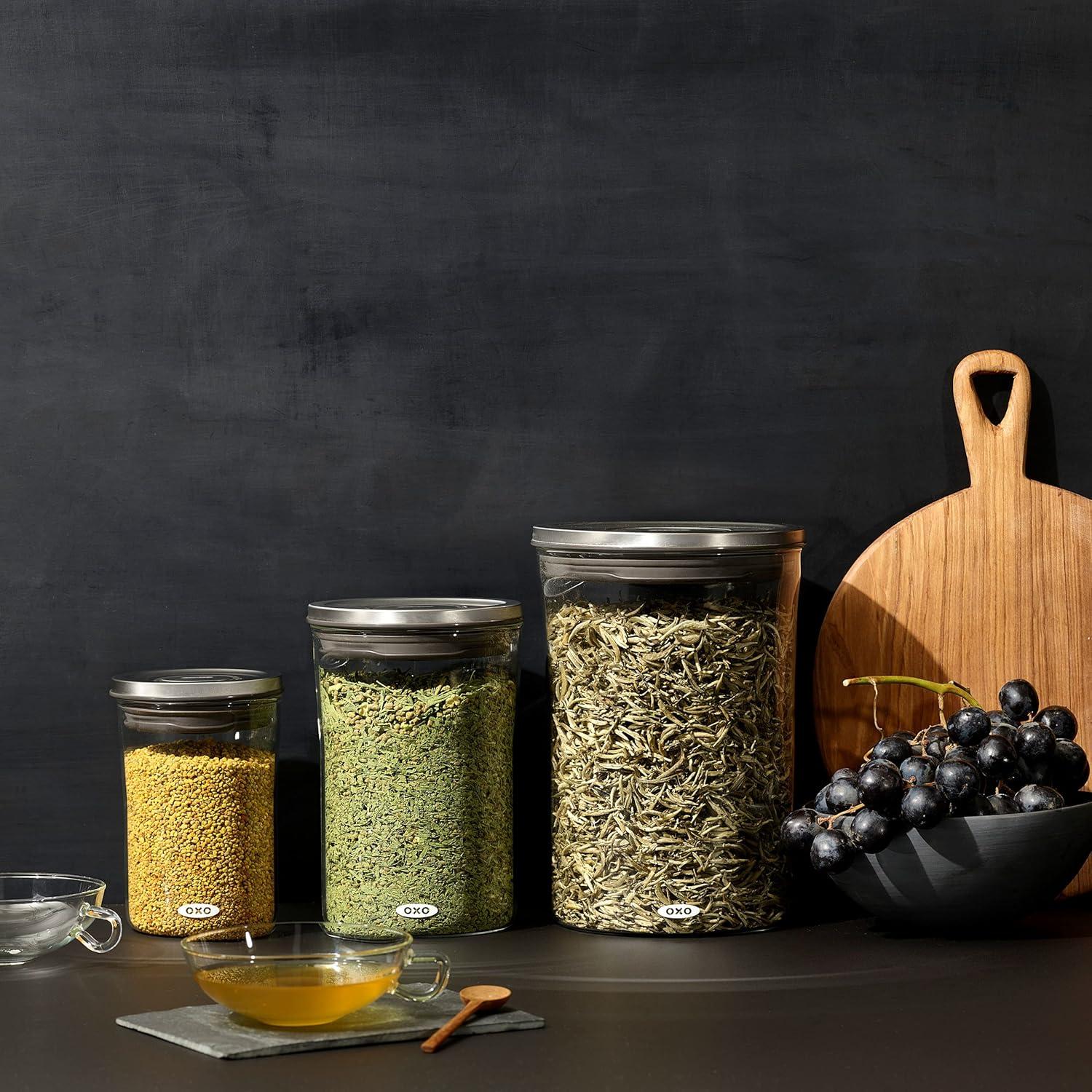 OXO Good Grips Round POP Containers are a smart solution for storing dry foods and keeping ingredients close at hand. Push-button lids create an airtight seal with a single press, so your favorite staples stay fresh. The button pops up for easy, one-handed opening. Each Container is sized to hold household essentials like cereal, flour, sugar, pasta, rice, coffee, nuts, snacks and more. Containers nest with their lids on for convenient storage. POP Containers aren’t just for kitchens: Use them any place you want more organization. For best results, always use the button to open and close. Do not carry POP Containers by the lid. BPA free. Dishwasher safe. Set includes: one 5.2 Qt/4.9 L Container, one 3.3 Qt/3.1 L Container and one 1.5 Qt/1.4 L Container