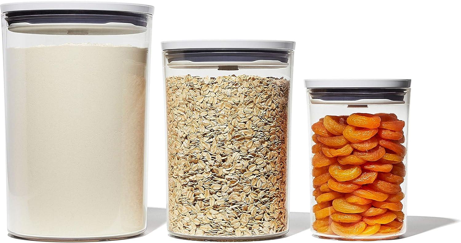 OXO Good Grips Round POP Containers are a smart solution for storing dry foods and keeping ingredients close at hand. Push-button lids create an airtight seal with a single press, so your favorite staples stay fresh. The button pops up for easy, one-handed opening. Each Container is sized to hold household essentials like cereal, flour, sugar, pasta, rice, coffee, nuts, snacks and more. Containers nest with their lids on for convenient storage. POP Containers aren’t just for kitchens: Use them any place you want more organization. For best results, always use the button to open and close. Do not carry POP Containers by the lid. BPA free. Dishwasher safe. Set includes: one 5.2 Qt/4.9 L Container, one 3.3 Qt/3.1 L Container and one 1.5 Qt/1.4 L Container