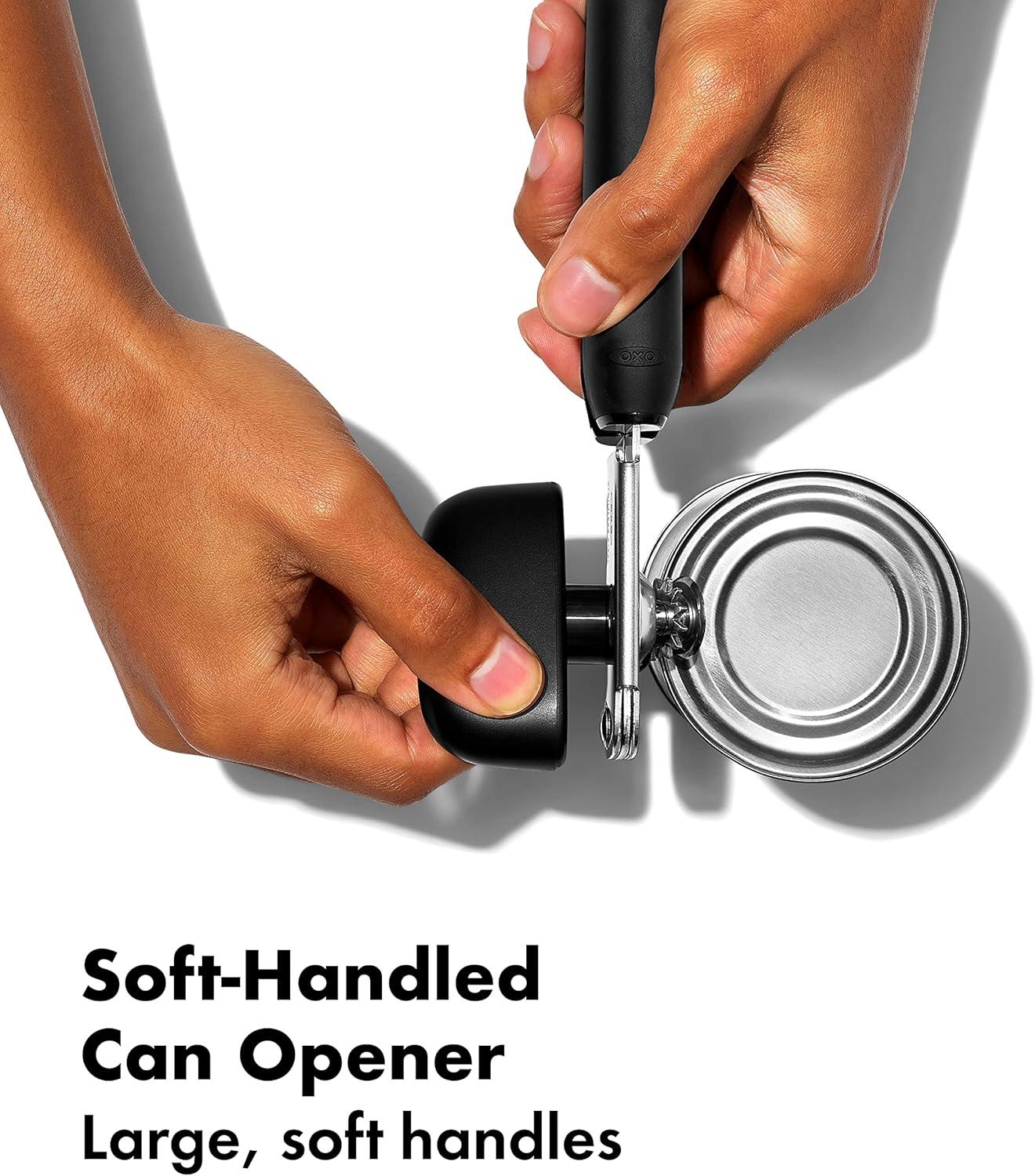 Can Opener has soft handles and knob for comfort and ease