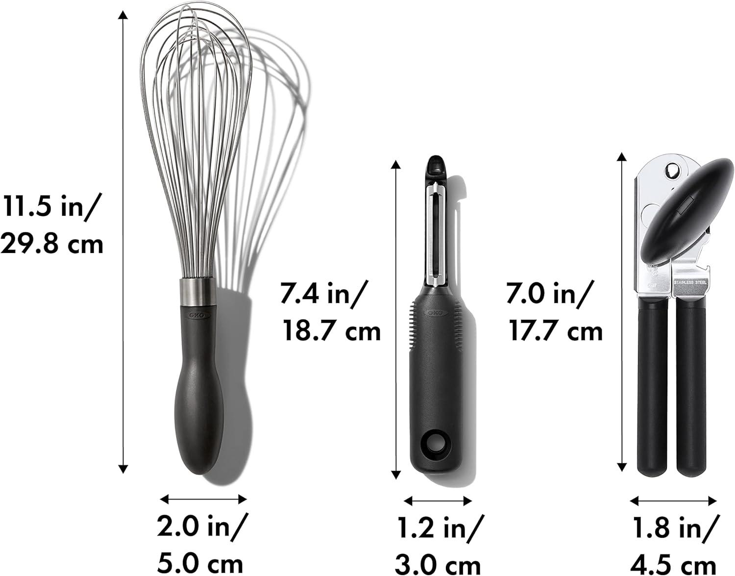 Tackle common kitchen duties with this convenient set featuring our top three best-selling tools. The OXO Good Grips 3-Piece Everyday Kitchen Tool and Utensil Set includes Swivel Peeler, 11-in/28 cm Balloon Whisk, and Soft-Handled Can Opener. These everyday essentials add comfort and convenience to common kitchen tasks. All feature our signature non-slip grip and comfortable handles.