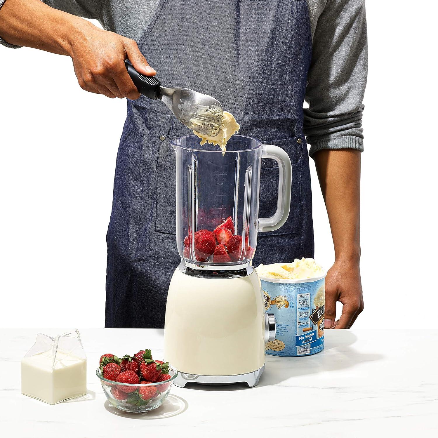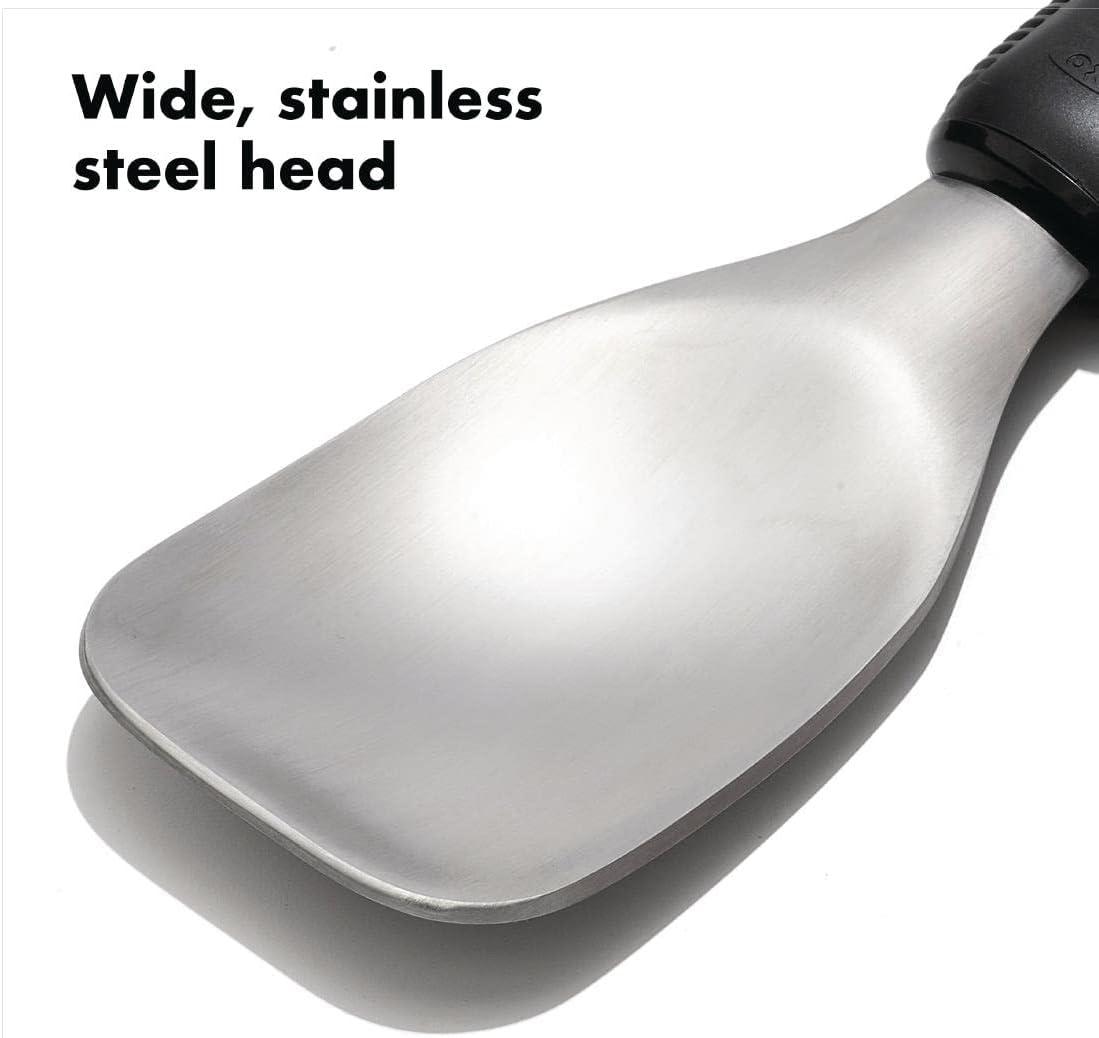 Scoop even the hardest ice cream with the durable OXO Good Grips Ice Cream Spade. It has a wide, stainless steel head that’s perfect for scooping large servings and packing pints. The soft, comfortable handle won’t get cold, and it stays non-slip, even when wet. Dishwasher safe.