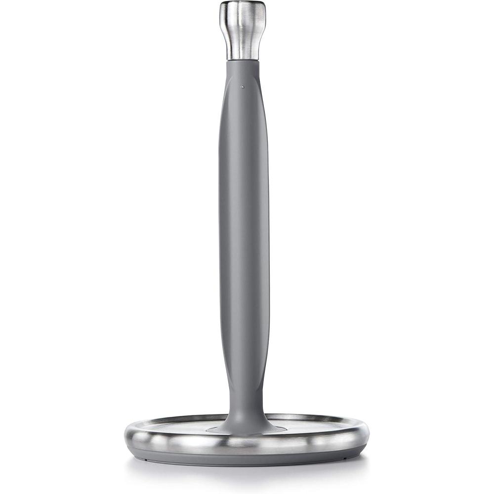 The last thing you want when cleaning up a spill is to deal with an unwieldy paper towel holder. The OXO Good Grips Steady Paper Towel Holder is engineered for one-handed tearing, so you get precisely the amount you need, no matter the mess. Imagine your in your kitchen and you hear someone in the next room knock over a glass — whoops Our countertop paper towel dispenser features smooth rotation, letting you rip on the run. If spills are frequent occurrence in your house (we get it), the raised lip on our paper towel rack keeps even jumbo-sized rolls contained. The weighted, non-slip base provides extra stability, while the silver paper towel holder, made of stainless steel, is built to last and look great as a paper towel holder for kitchen or bathroom. Plus, the clever built-in carrying knob means you can grab it and go to any room of the house.