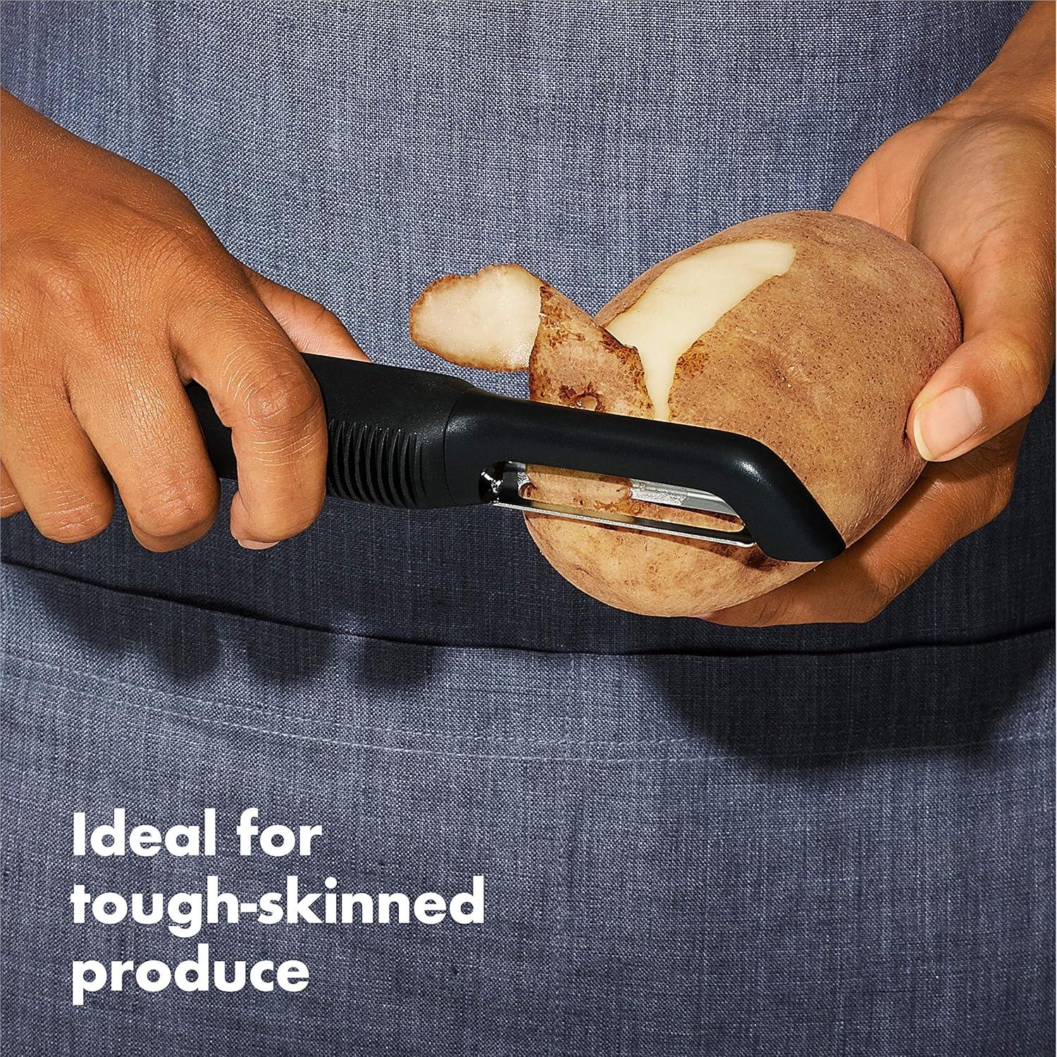 The OXO Good Grips Swivel Peeler is perfect for prepping tough-skinned fruits and vegetables. Twin stainless steel blades flex to remove large swaths of skin with each stroke. The comfortable, oversized handle was designed for fast, repetitive use and won’t slip, even when wet. A durable, built-in eye remover carves out blemishes without ruining your produce. The Peeler is dishwasher safe and includes a large in-handle hole for simple storage. Whether peeling a Granny Smith apple or a fruit with an even tougher skin, the OXO swivel peeler is an essential tool in any kitchen. Its flexible, rotating stainless-steel blades make peeling simple by contouring to almost any surface shape. The built-in potato eye remover is durable and can easily carve out blemishes without digging. The Good Grips line features durable, nonslip, flexible handles on every product. Ergonomically designed to fit the palm comfortably and softly, the pressure-absorbing processed rubber handle puts less tension on the hands while still providing an outstanding grip. Made from the same material as dishwasher gaskets, the handles are slip-proof–wet or dry–as well as dishwasher-safe. Good Grips products have won the Tylenol/Arthritis Foundation Design Award.