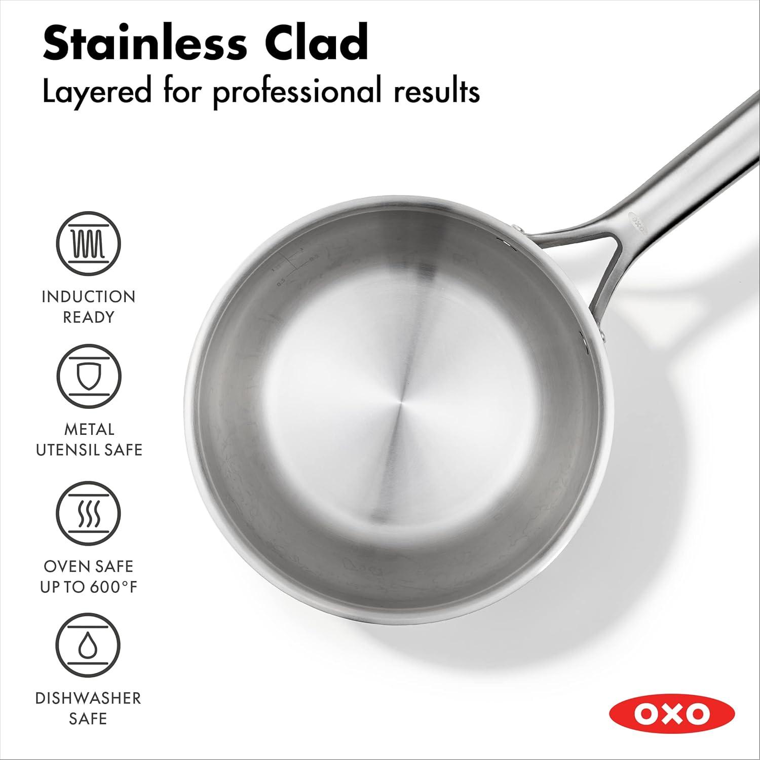 OXO Mira Tri-Ply Stainless Steel, 5QT Stock Pot with Lid, Induction, Multi Clad, Dishwasher and Metal Utensil Safe(1.5QT & 3.57QT Chef’s Pans with Lids)