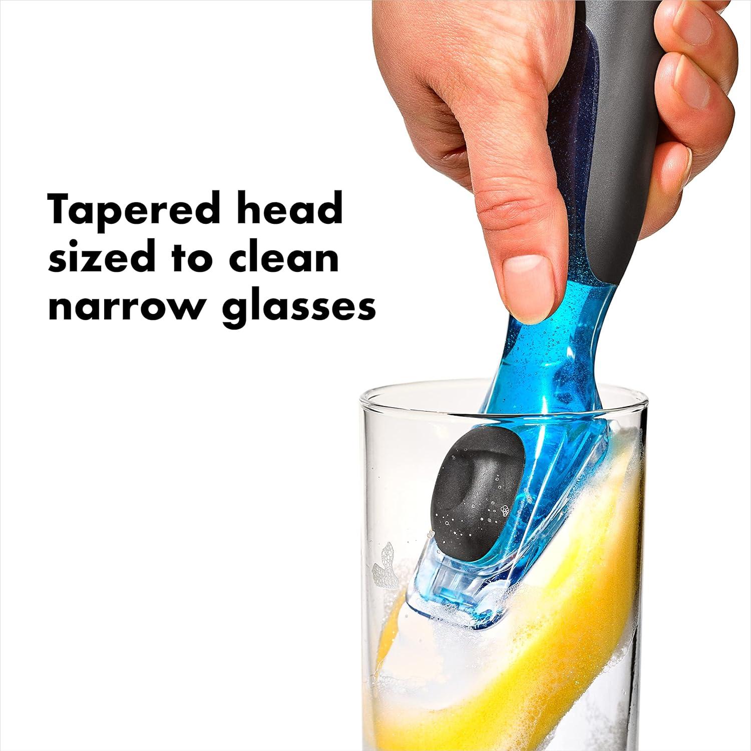 OXO's Soap Dispensing Dish Sponge combines a long handled sponge with liquid dish soap for convenient cleaning. A light push of the soft, non-slip button on the body easily dispenses a steady stream of soap for any scrubbing task. To refill, simply unscrew the back end of the handle and add soap to the reservoir. Replacing the cap when finished engages a tight, leak-proof seal so soap only goes where you want it. The soft grip is comfortable to hold and is non-slip, even when wet. The durable, disinfectant sponge features a unique shape for thorough cleaning inside corners and along curves. For the toughest baked-on food, use the built-in scraper on the backside of the head. When it's time for a new sponge head, simply push up on the tab to replace it. Replacement brush, sponge, scrub heads sold separately.