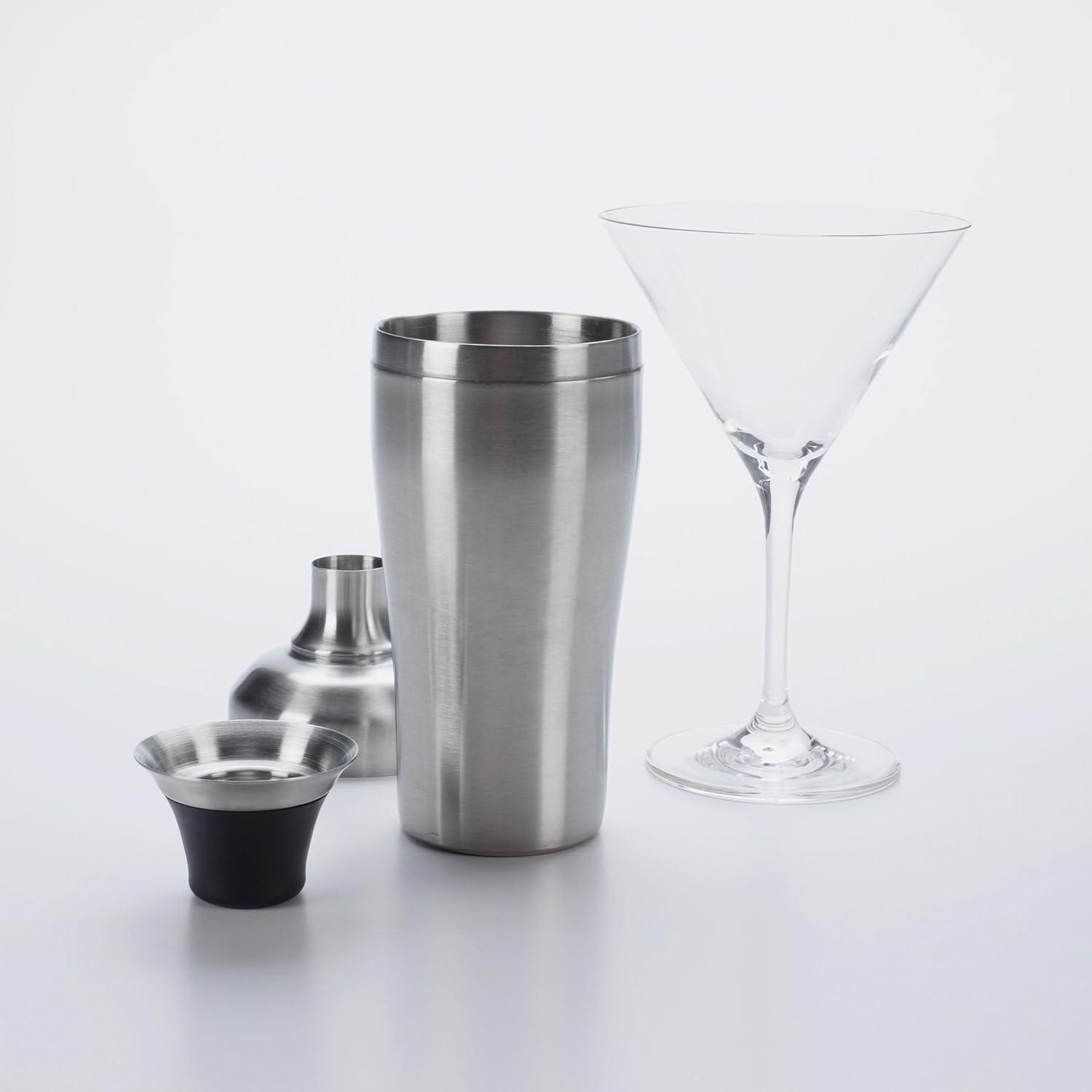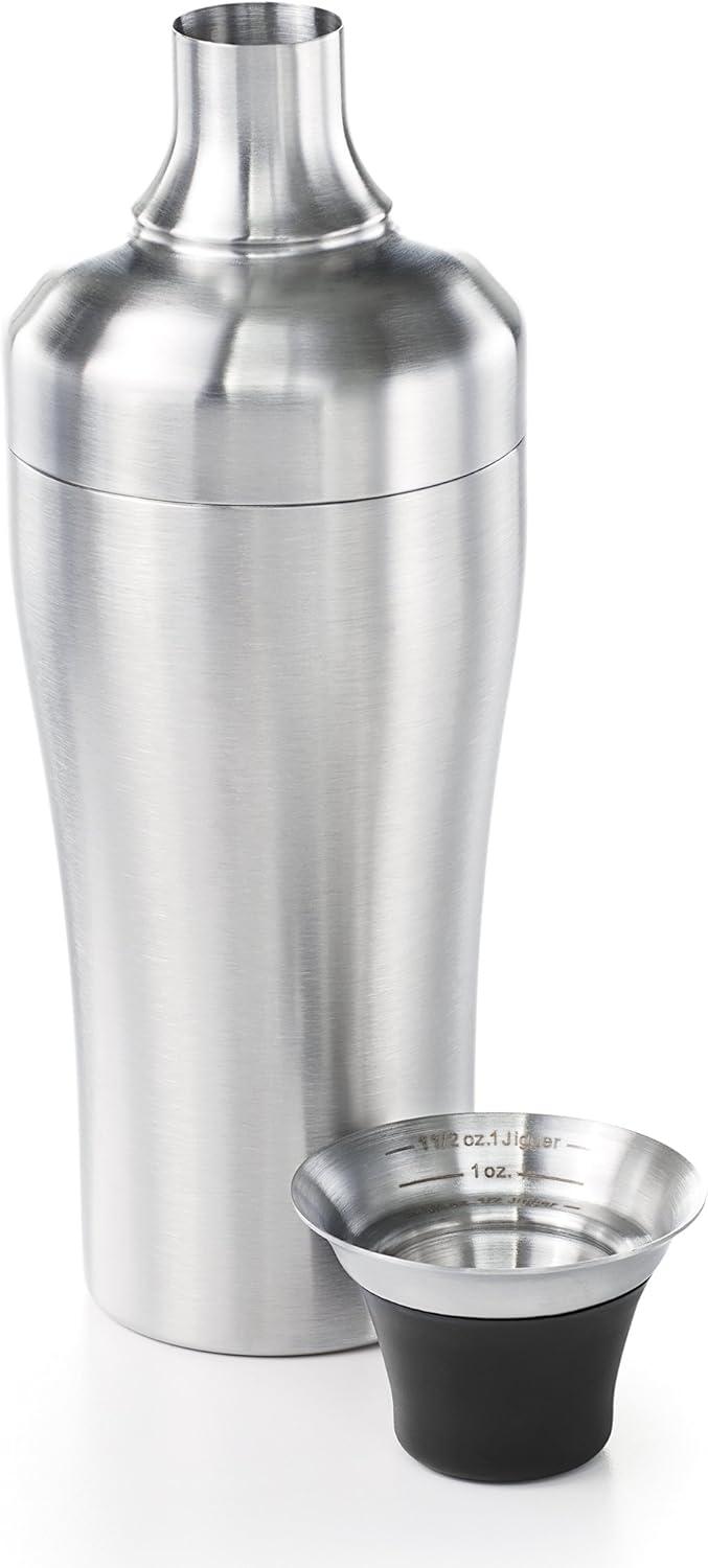 Brushed stainless steel inside and out gives this cocktail shaker a sleek, modern look. Double-walled construction means less condensation, keeping hands from slipping while shaking up favorite drinks. A soft-grip outer cover on the jigger (which doubles as a lid) allows it to be held securely while adding liquid to any of three measurement markings: 1-1/2, 1, and 3/4 ounces. A built-in strainer prevents unwanted ice from falling into glasses. The shaker measures 9 by 3-1/2 inches and complements other stainless-steel accessories in OXOs barware collection. OXO backs all its products with a satisfaction warranty, and will replace or refund any returned item. –Ann Bieri
