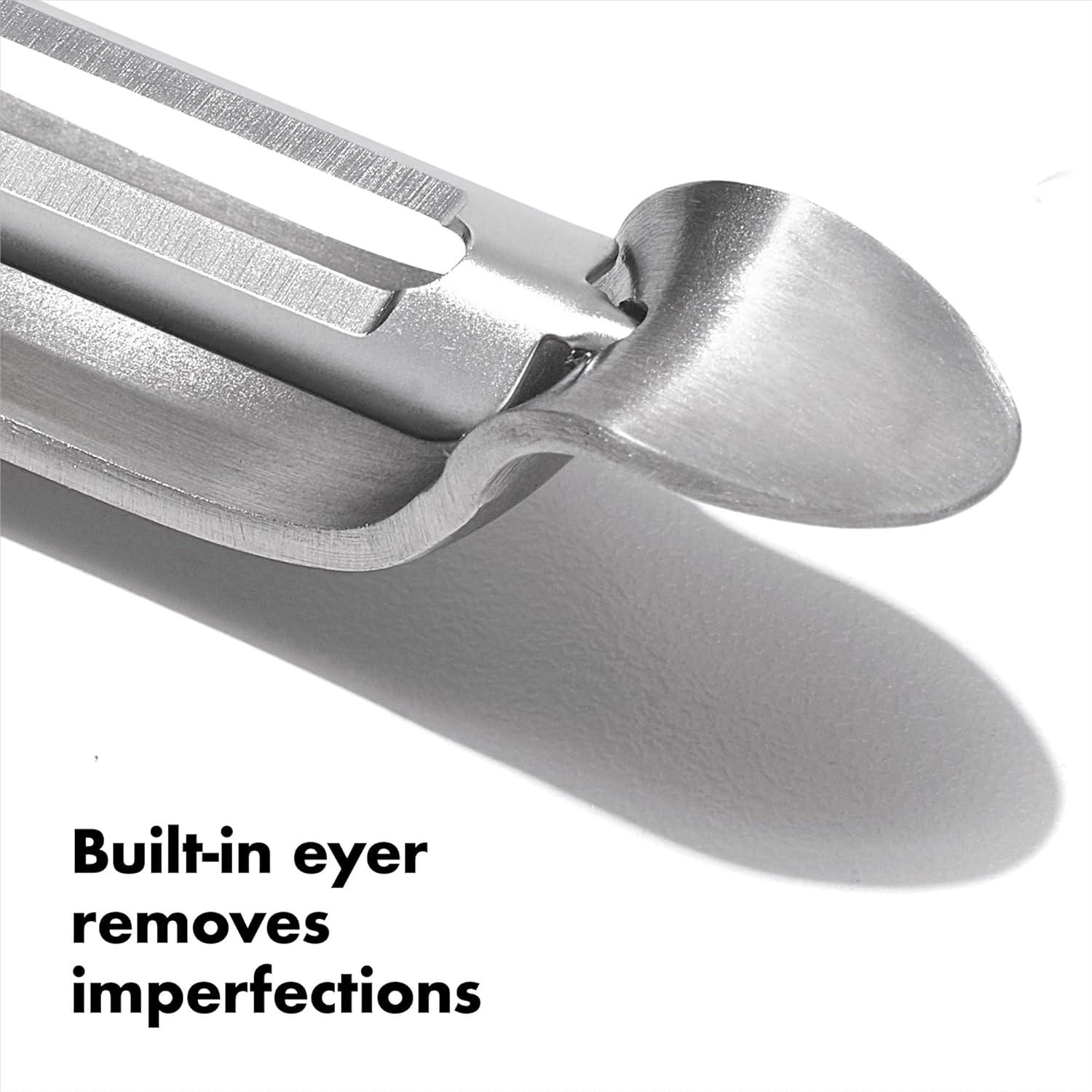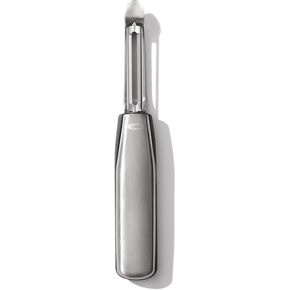 Need to peel a bushel of apples? Or a few pounds of potatoes? The OXO Steel Swivel Peeler can make quick work of the task. One of our most iconic tools, the Peeler features a sharp stainless steel blade, which swivels to glide effortlessly around firm fruits and vegetables. The blade digs under skin but leaves all the good stuff underneath intact. There's also a built-in eyer to remove imperfections in a single scoop. And the sleek handle gives a pro-level look while also providing a comfortable grip.