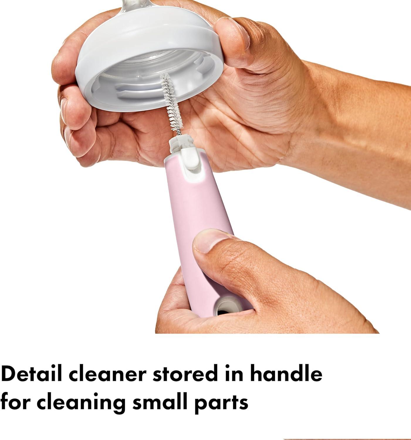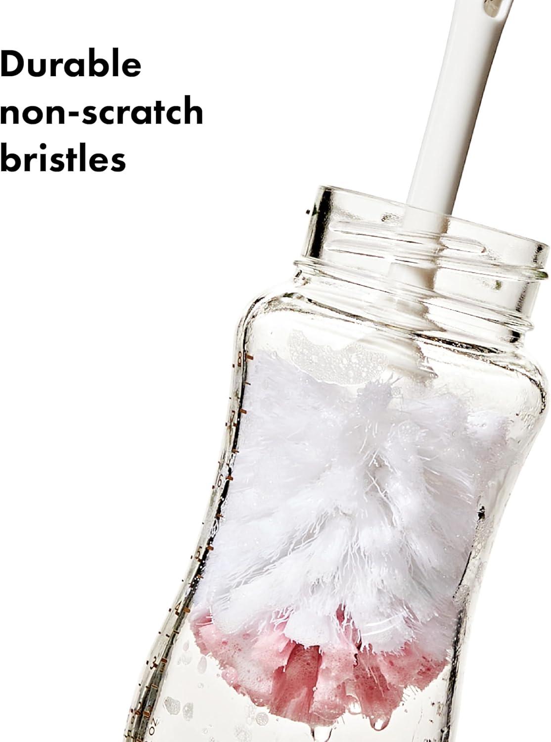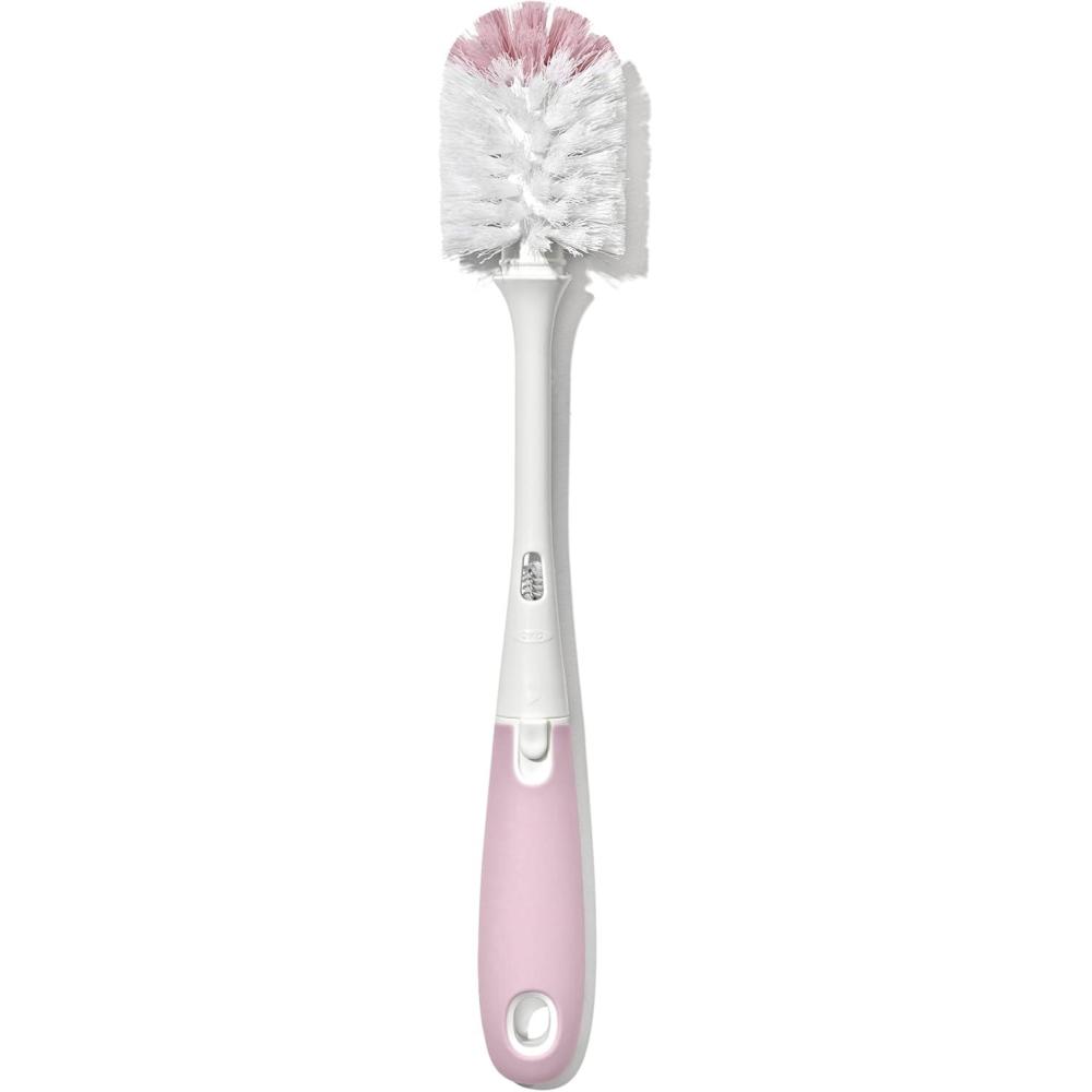 The OXO Tot Bottle Brush with detail cleaner is ideal for deep cleaning baby bottles and more. The brush head includes both soft and firm bristles for gentle cleaning and serious scrubbing. The flexible handle features a non-slip grip so you can clean in comfort, even with wet hands. A hidden detail cleaner is made of soft but sturdy silicone and is perfect for hitting tight spots inside bottle nipples and breast pump parts. BPA and PVC free. Dishwasher safe.