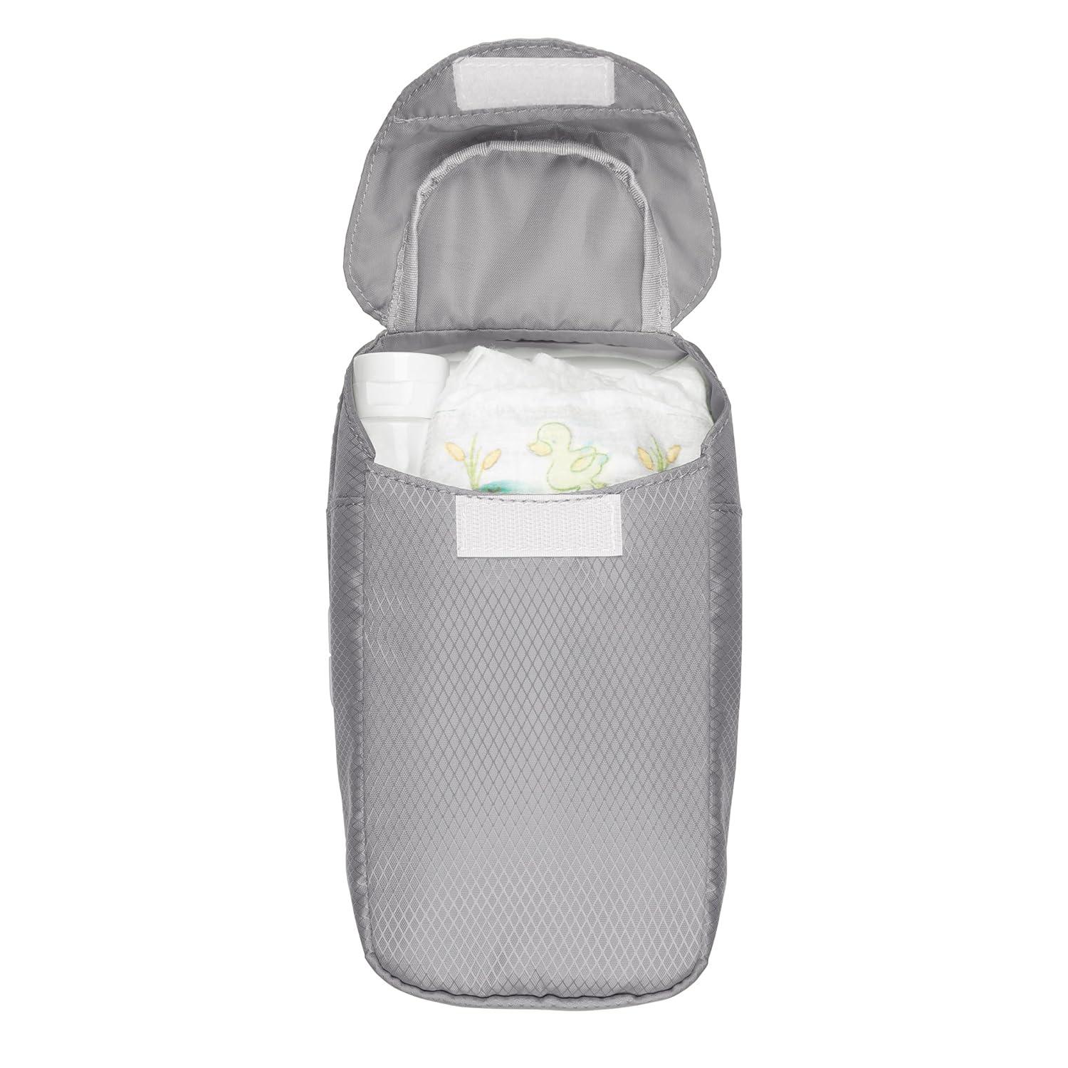 Shaped to tuck easily into diaper bags, handbags, or stroller pockets, the OXO tot On-the-Go Wipes Dispenser with Diaper Pouch is a must-have item. Changing your baby is a snap using this wipes container with added fabric pouch that holds up to 5 diapers.