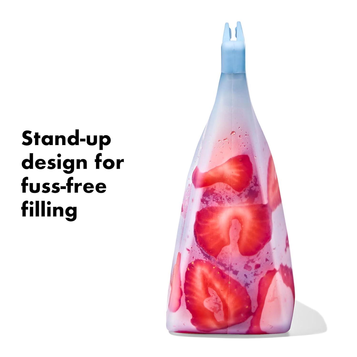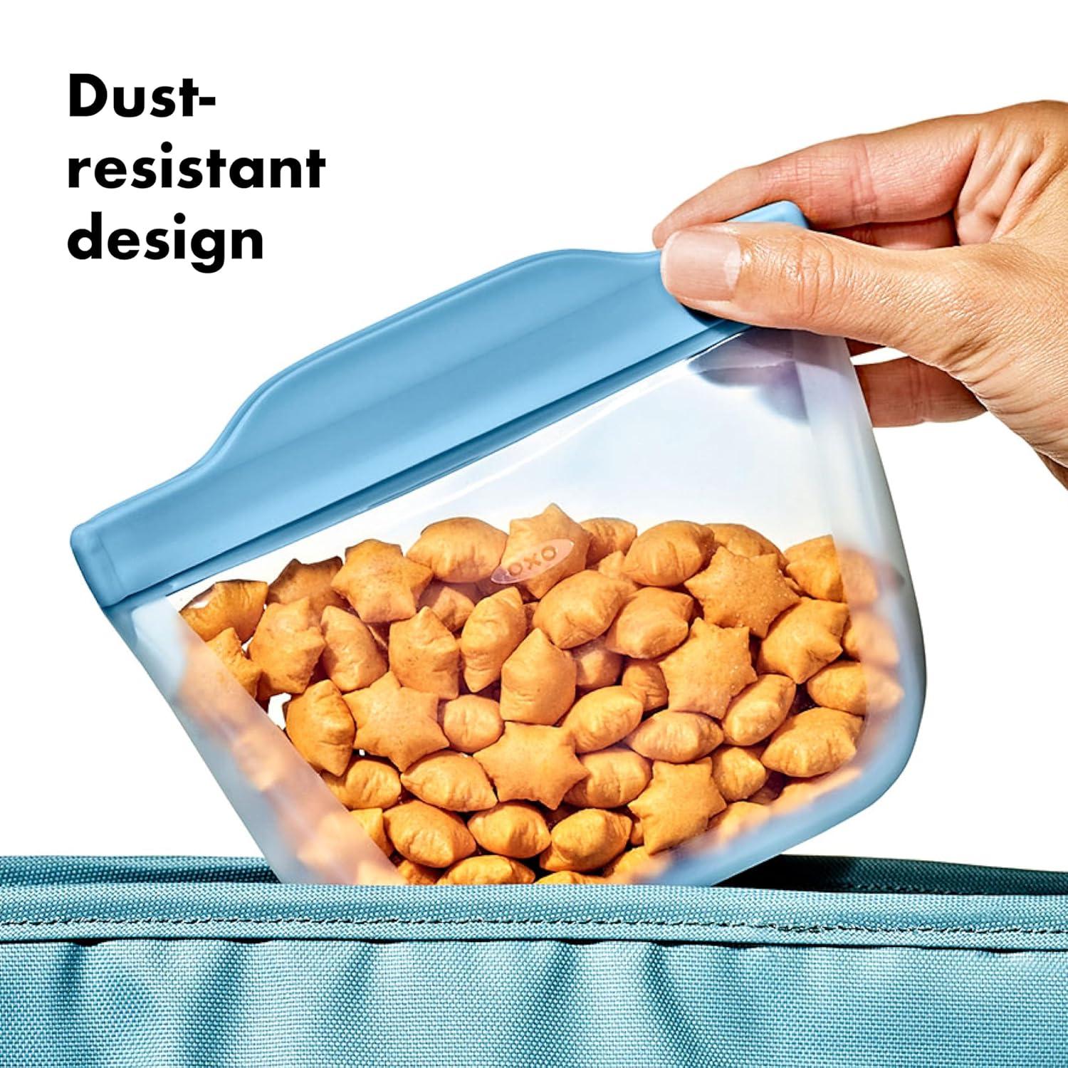 ake snacktime to the next level with a reusable alternative to finicky, single-use plastic baggies. The OXO Tot Silicone Reusable Bags keep snacks fresh with a strong seal, and are seamless for easy, thorough cleaning. They flip inside out to get fully clean in the dishwasher or by hand. The Stand-Up Cups have a flat bottom and a wide opening for filling and snacking with less fumbling, whether you’re filling the 8 oz./235 mL Stand-Up Cup with dry cereal or sliced grapes, or the 12 oz./355 mL Snack Bag with small crackers or a sliced apple. These Cups are also great for keeping small toys or baby accessories from getting lost at the bottom of bags. Freezer, microwave, and oven safe. BPA-free, PVC-free, and Phthalate-free food-grade silicone.