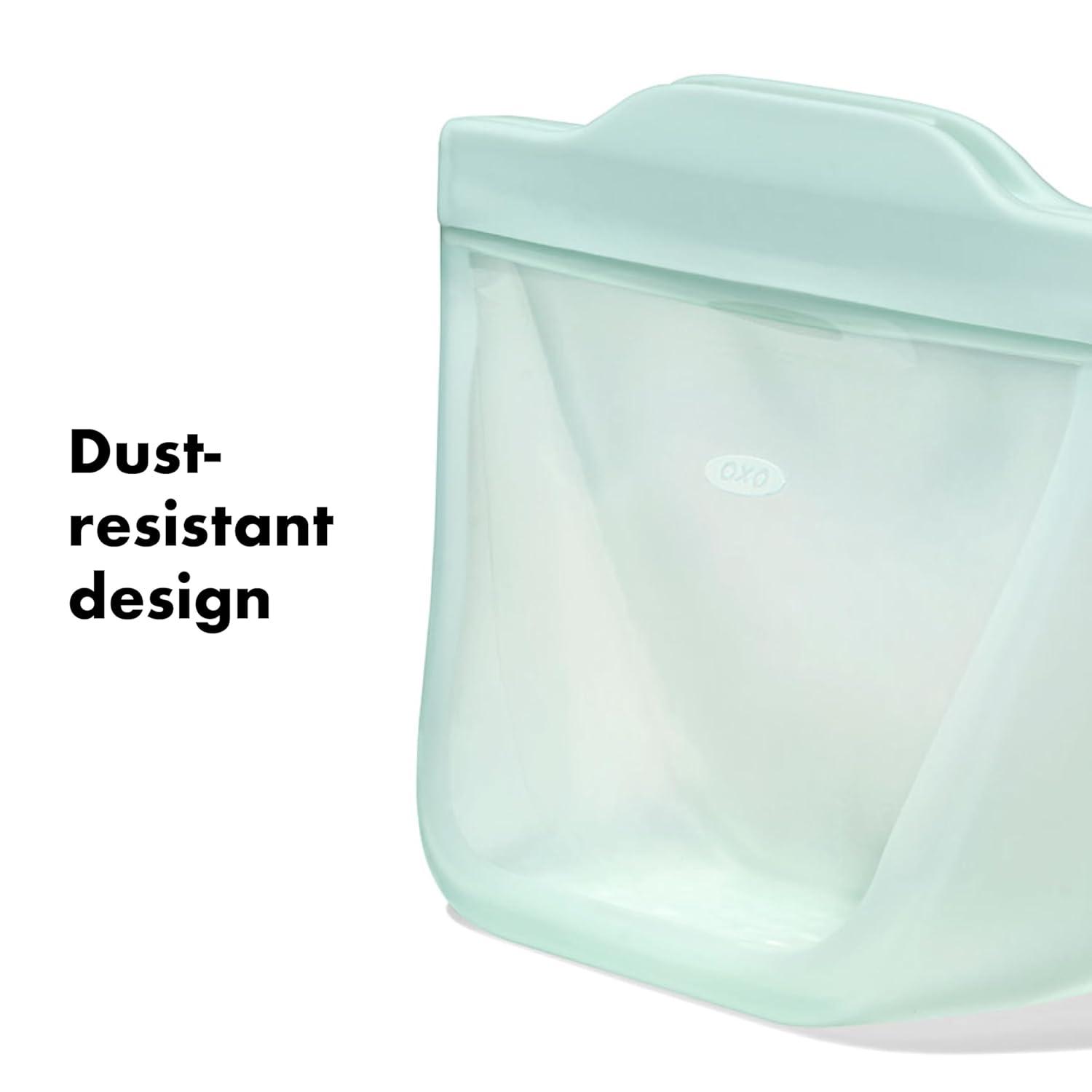 ake snacktime to the next level with a reusable alternative to finicky, single-use plastic baggies. The OXO Tot Silicone Reusable Bags keep snacks fresh with a strong seal, and are seamless for easy, thorough cleaning. They flip inside out to get fully clean in the dishwasher or by hand. The Stand-Up Cups have a flat bottom and a wide opening for filling and snacking with less fumbling, whether you’re filling the 8 oz./235 mL Stand-Up Cup with dry cereal or sliced grapes, or the 12 oz./355 mL Snack Bag with small crackers or a sliced apple. These Cups are also great for keeping small toys or baby accessories from getting lost at the bottom of bags. Freezer, microwave, and oven safe. BPA-free, PVC-free, and Phthalate-free food-grade silicone.