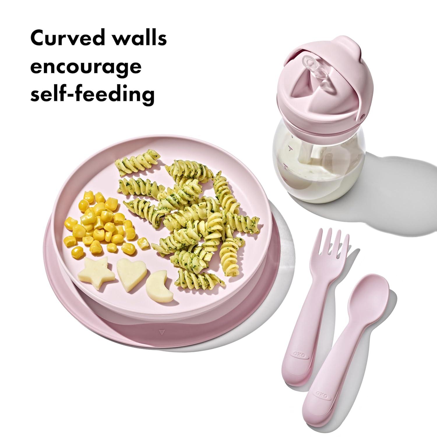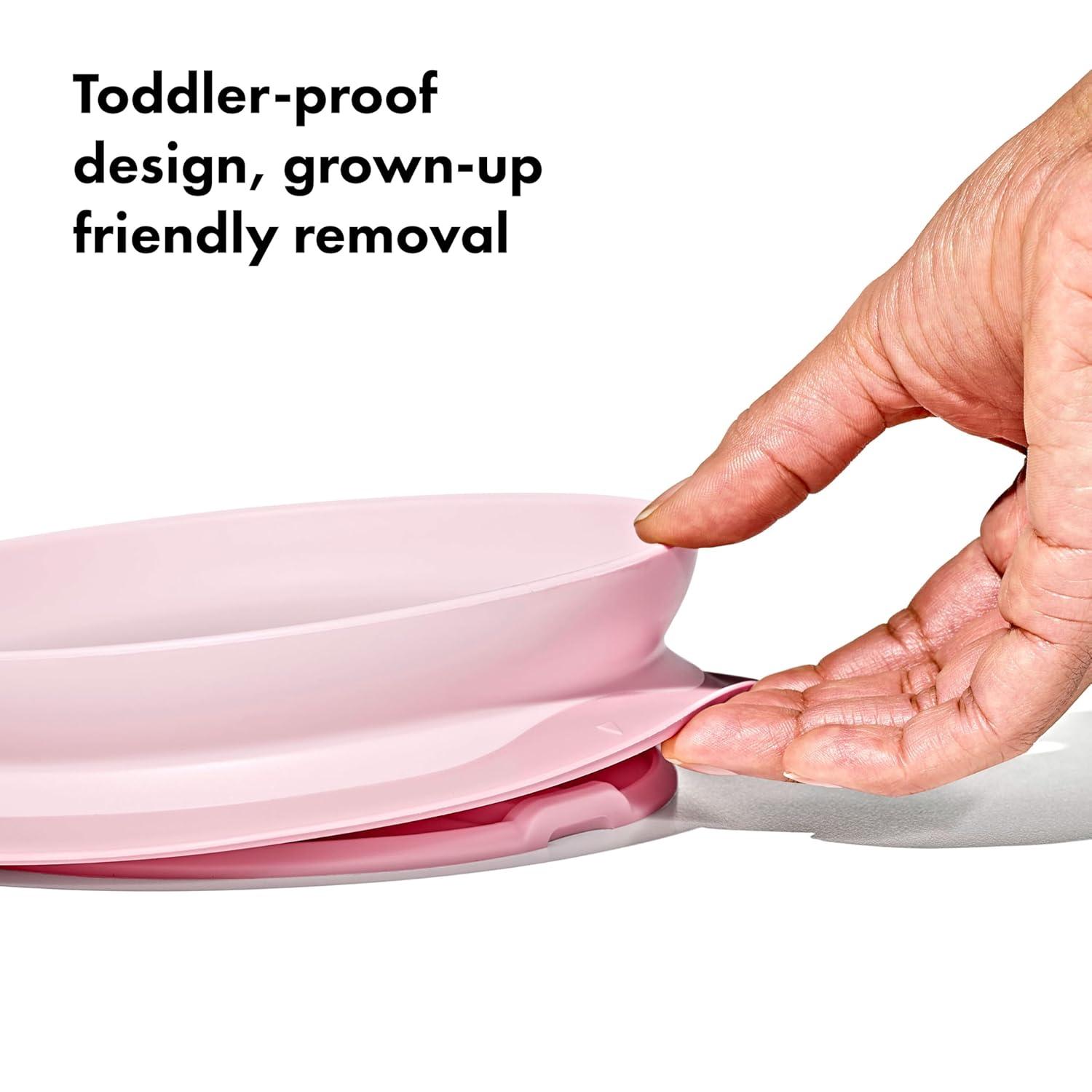 Cut down on mealtime messes with the OXO Tot Stick & Stay Suction Plate. The Plate features a silicone base that sticks surfaces until mealtime is over, preventing sliding, slipping and tipping. A parent-friendly opening makes removing the Plate simple for adults, but tough for kids. Tall, curved side walls allow for easy scooping and encourage self-feeding. When your child is finished, twist the Plate and base apart for quick cleaning in the dishwasher.