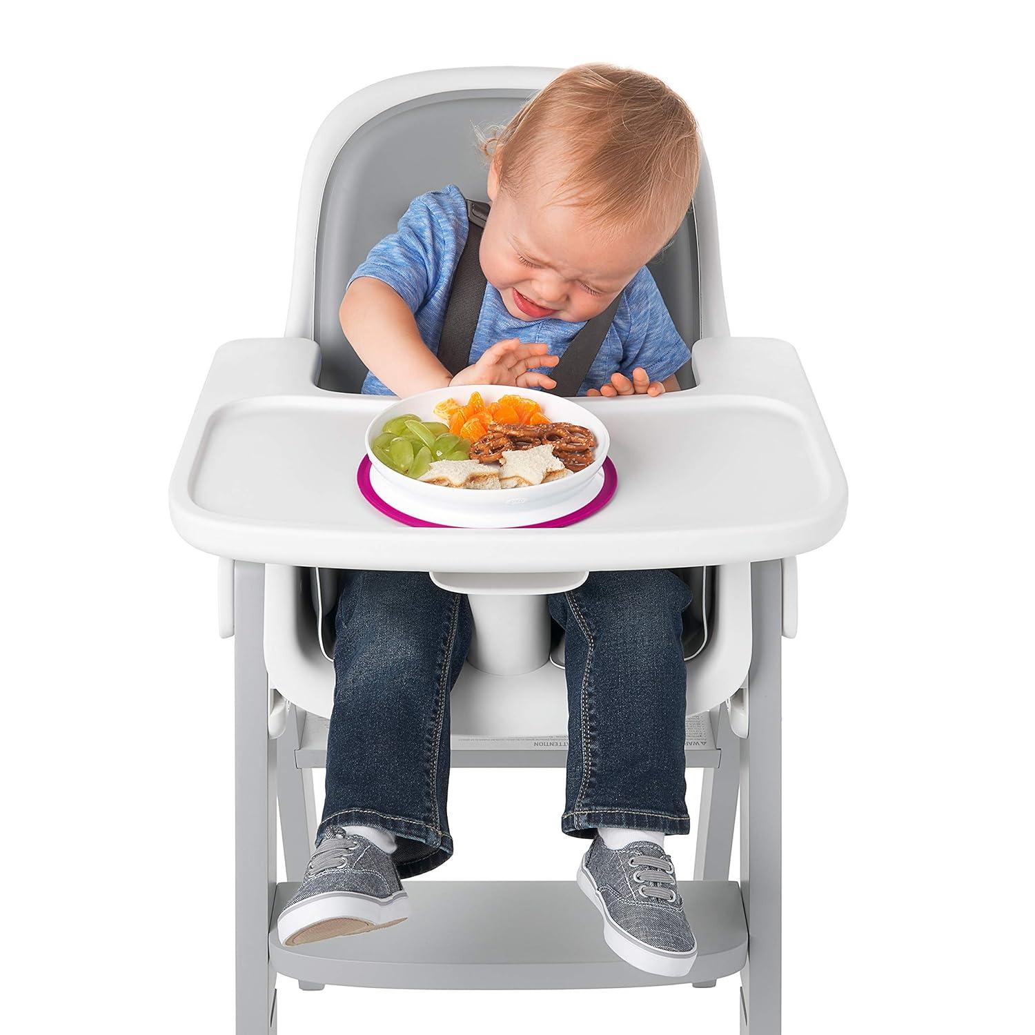 Cut down on mealtime messes with the OXO Tot Stick & Stay Suction Plate. The Plate features a silicone base that sticks surfaces until mealtime is over, preventing sliding, slipping and tipping. A parent-friendly opening makes removing the Plate simple for adults, but tough for kids. Tall, curved side walls allow for easy scooping and encourage self-feeding. When your child is finished, twist the Plate and base apart for quick cleaning in the dishwasher.